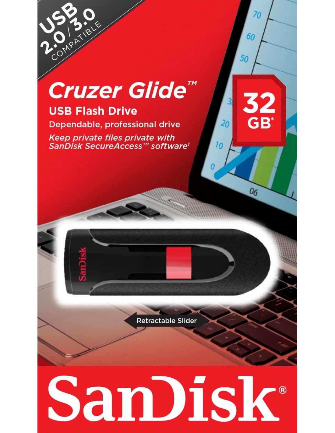 L’unità flash USB Cruzer Glide presenta un elegante design compatto con un attraente schema cromatico nero e rosso. Le dimensioni ridotte consentono di riporla agevolmente in una tasca o in una borsetta. Per retrarre il connettore USB e proteggerlo quando non è in uso, basta tirare il cursore.