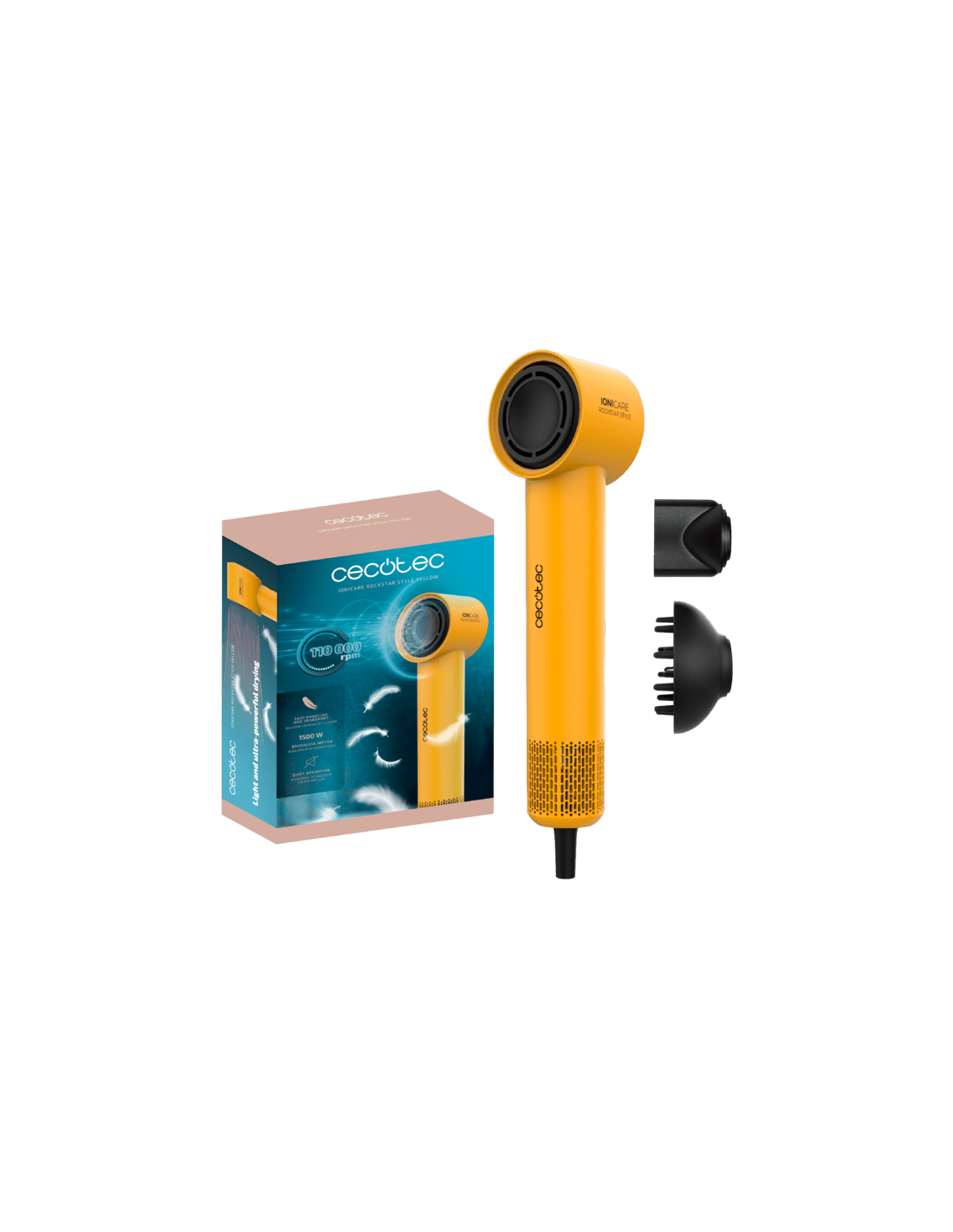 Cecotec IoniCare RockStar Style. Velocità motore: 110000 Giri/min. Colore del prodotto: Nero, Giallo, Colorazione superficie: Monocromatico, Tipo di controllo: Pulsanti. Potenza: 1500 W, Tensione di ingresso AC: 220 - 240 V, Frequenza di ingresso AC: 50/60 Hz. Durata della garanzia: 3 anno/i. Quantità per pacco: 1 pz, Tipo di imballo: Scatola