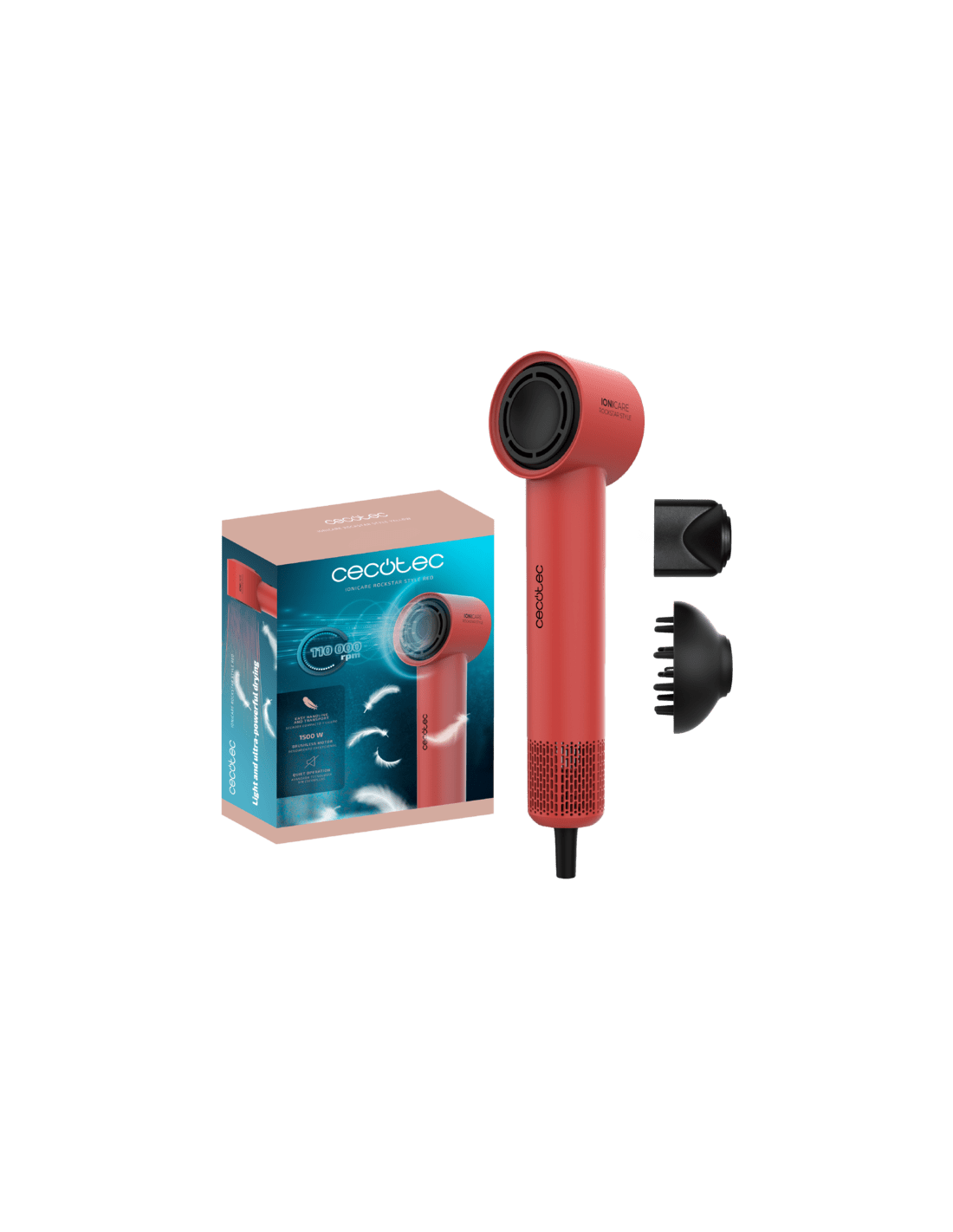 Cecotec IoniCare RockStar Style. Velocità motore: 110000 Giri/min. Colore del prodotto: Nero, Rosso, Colorazione superficie: Monocromatico, Tipo di controllo: Pulsanti. Potenza: 1500 W, Tensione di ingresso AC: 220 - 240 V, Frequenza di ingresso AC: 50/60 Hz. Durata della garanzia: 3 anno/i. Quantità per pacco: 1 pz, Tipo di imballo: Scatola