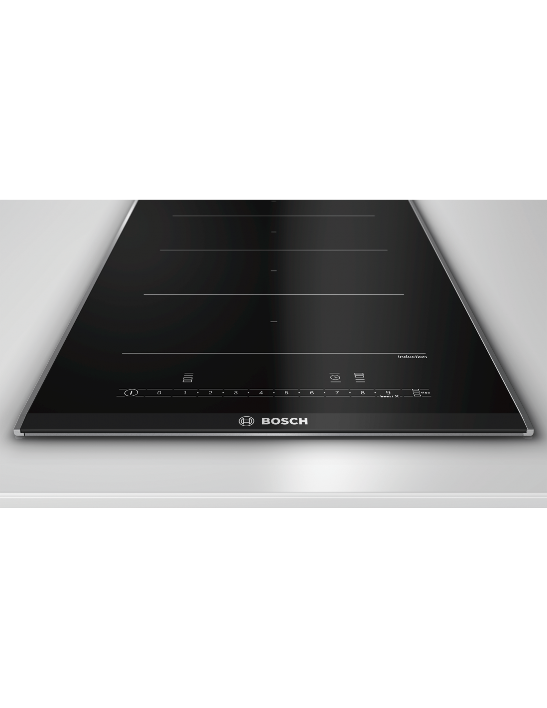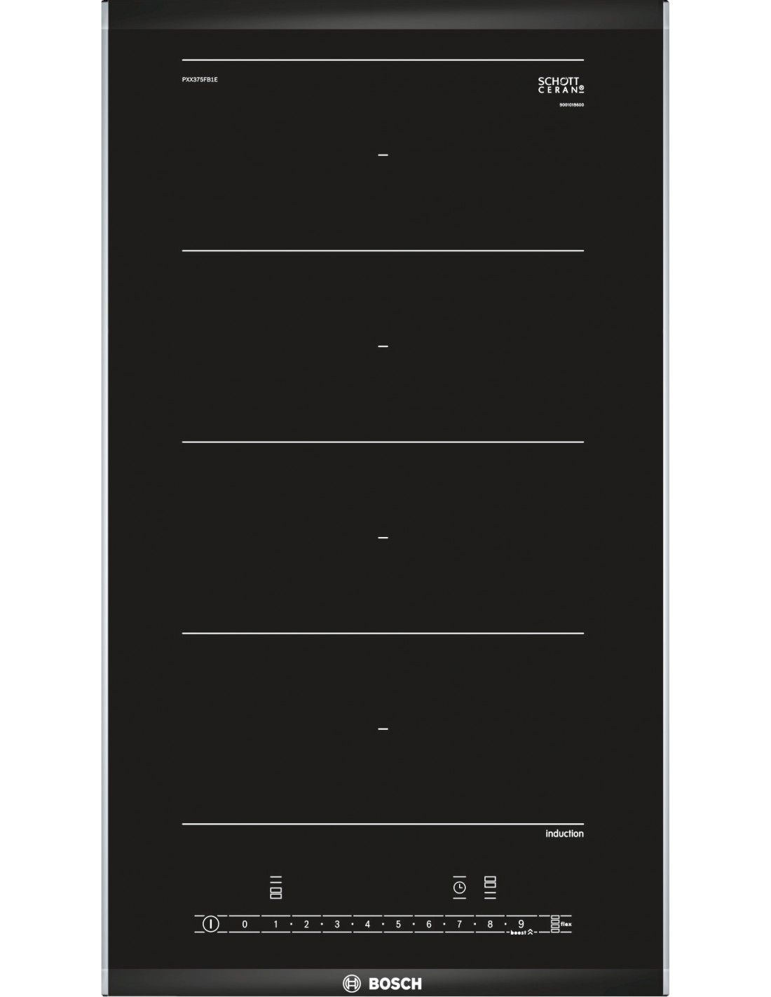 Bosch Serie 6 PXX375FB1E. Colore del prodotto: Nero, Posizionamento dell'apparecchio: Da incasso, Tipo di piano cottura: Piano cottura a induzione. Tipo di controllo: Touch, Posizione di controllo: Frontale superiore. Potenza aggregata (elettrica): 3700 W, Tensione di ingresso AC: 220 - 240 V. Larghezza: 306 mm, Profondità: 527 mm, Altezza: 51 mm