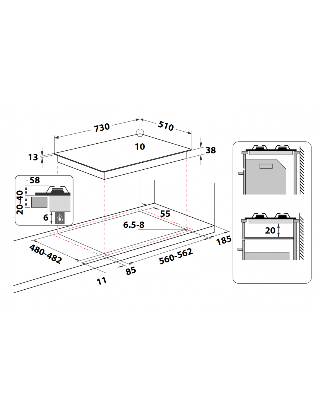 - Dimensione della larghezza del piano cottura