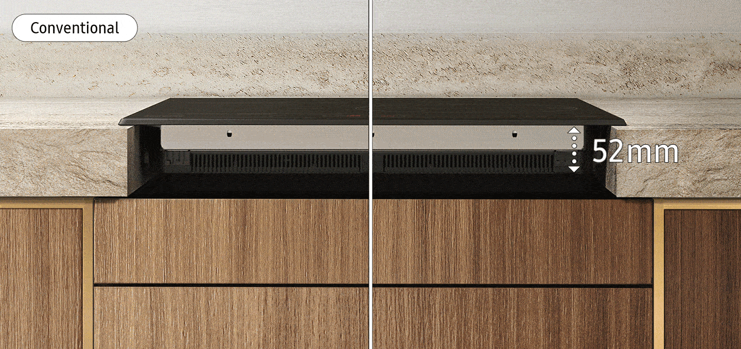 Aggiungi un’utile capienza extra alla tua cucina*. Il design Slim Fit del piano cottura si armonizza perfettamente con un’ampia varietà di piani di lavoro, a prescindere dal loro spessore. E questo significa che hai più spazio per un cassetto più largo e che è più facile da inserire, riducendo i tempi e i costi di installazione.* Confronto con il modello NZ84F7NC6AB/ET. Lo spessore del piano cottura è ridotto da 56 mm a 48 mm e lo spessore minimo del piano di lavoro è ridotto da 20 cm a 10 mm.