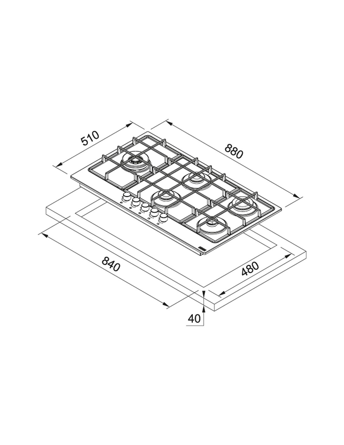 Franke Smart FHSM. Colore del prodotto: Acciaio inox, Posizionamento dell'apparecchio: Da incasso, Dimensione della larghezza del piano cottura: 88 cm. Bruciatore piccolo: 1000 W, Bruciatore medio: 1750 W, Bruciatore grande: 3000 W. Tipo di controllo: Manopola, Posizione di controllo: Front / Top front. Potenza aggregata (gas): 10800 W, Tensione di ingresso AC: 220 - 240 V. Larghezza: 880 mm, Profondità: 510 mm, Altezza: 40 mm