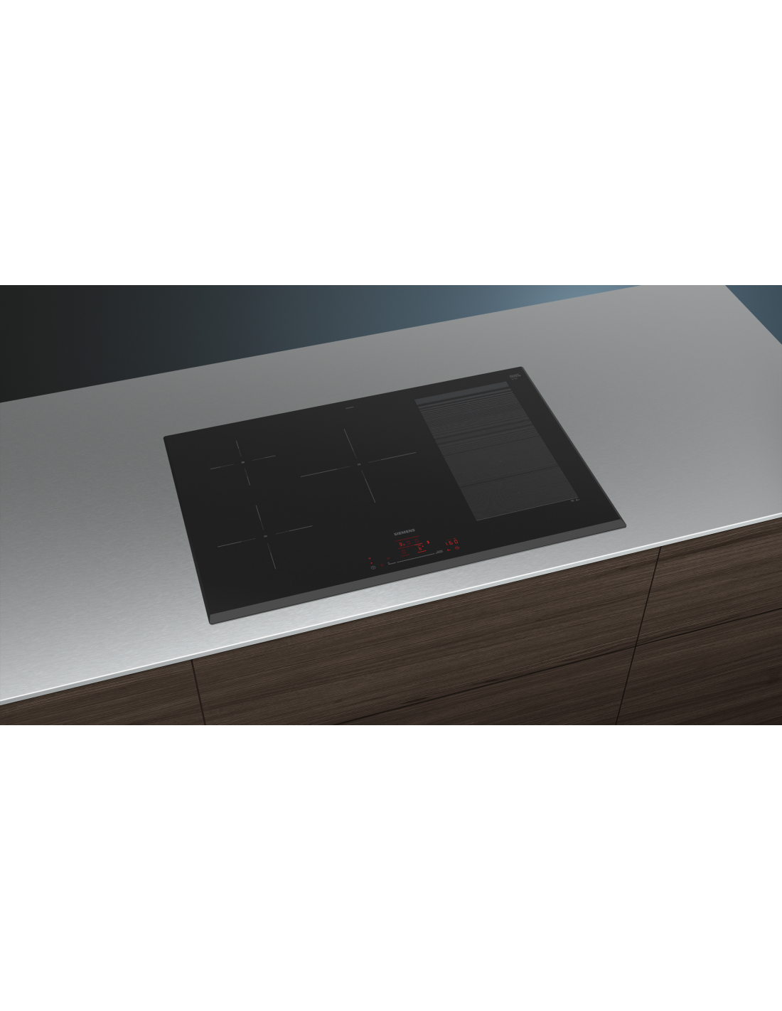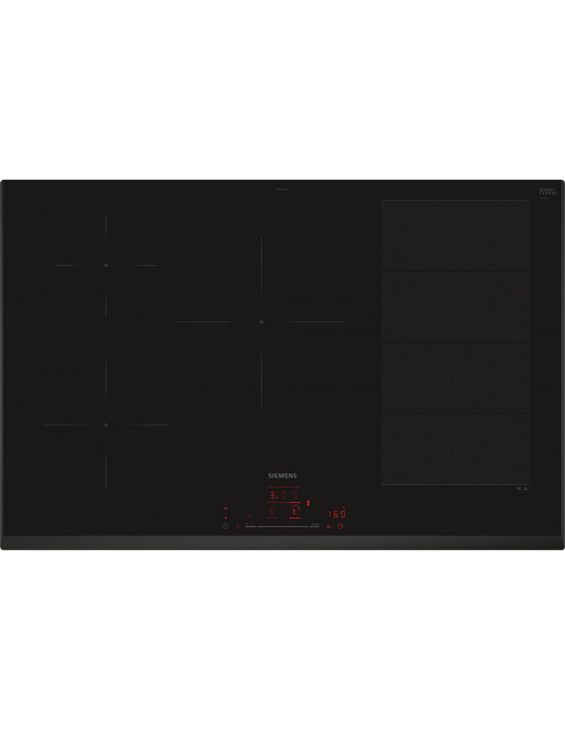 Siemens iQ700 EX851HVC1E. Colore del prodotto: Nero, Posizionamento dell'apparecchio: Da incasso, Dimensione della larghezza del piano cottura: 80 cm. Tipo di controllo: Touch, Posizione di controllo: Frontale, Tipo di orologio: Elettronico. Potenza aggregata (elettrica): 7400 W, Tensione di ingresso AC: 220 - 240 V, Frequenza di ingresso AC: 50 - 60 Hz. Larghezza: 802 mm, Profondità: 522 mm, Altezza: 51 mm. Larghezza imballo: 953 mm, Profondità imballo: 608 mm, Altezza imballo: 126 mm
