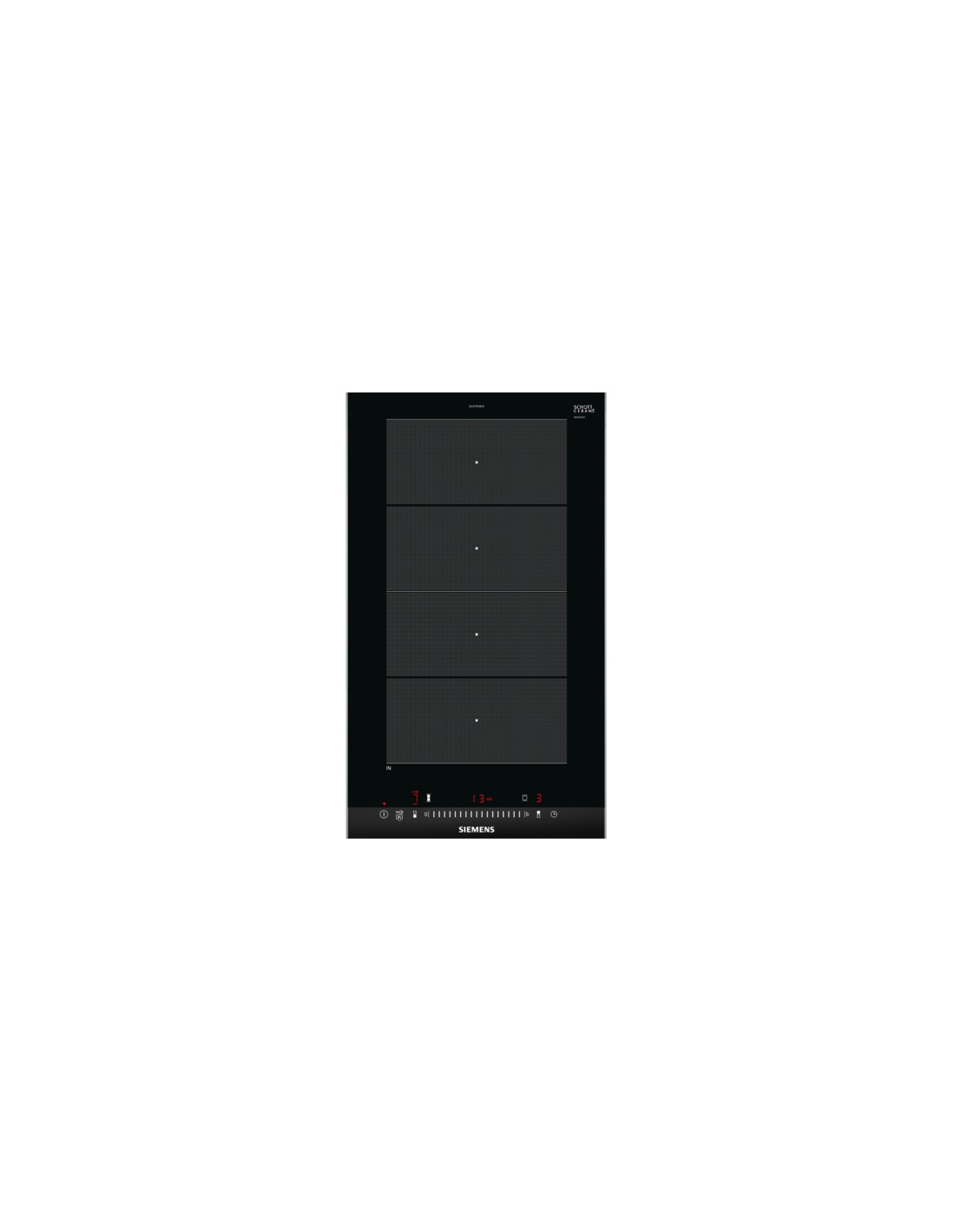 Siemens EX375FXB1E. Colore del prodotto: Nero, Posizionamento dell'apparecchio: Da incasso, Tipo di piano cottura: Piano cottura a induzione. Bruciatore piccolo: 3700 W, Bruciatore medio: 3700 W. Tipo di controllo: Touch, Posizione di controllo: Frontale superiore, Tipo di display: LED. Potenza aggregata (elettrica): 3700 W, Tensione di ingresso AC: 220-240 V, Frequenza di ingresso AC: 50 - 60 Hz. Larghezza: 302 mm, Profondità: 520 mm, Altezza: 51 mm