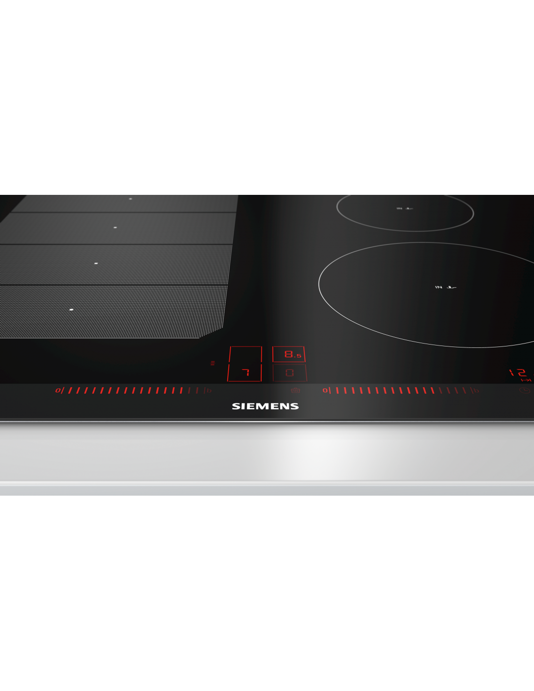 Siemens EX775LEC1E. Colore del prodotto: Nero, Posizionamento dell'apparecchio: Da incasso, Tipo di piano cottura: Piano cottura a induzione. Bruciatore piccolo: 1400 W, Bruciatore medio: 2200 W, Bruciatore grande: 2200 W. Tipo di controllo: Touch, Posizione di controllo: Frontale superiore. Potenza aggregata (elettrica): 7400 W, Tensione di ingresso AC: 220-240 V, Frequenza di ingresso AC: 50 - 60 Hz. Larghezza: 710 mm, Profondità: 520 mm, Altezza: 51 mm