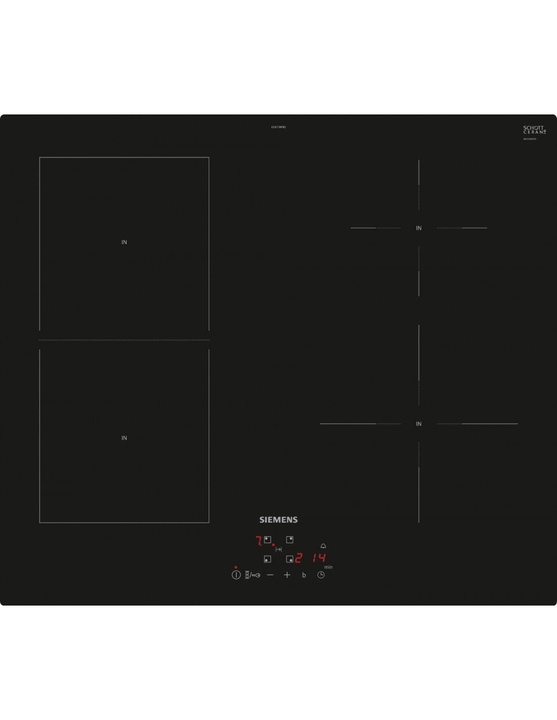 Siemens iQ500 EE611BPB5E. Colore del prodotto: Nero, Posizionamento dell'apparecchio: Da incasso, Dimensione della larghezza del piano cottura: 60 cm. Tipo di controllo: Touch, Posizione di controllo: Frontale, Tipo di timer: Digitale. Potenza aggregata (elettrica): 4600 W, Tensione di ingresso AC: 220 - 240 V, Frequenza di ingresso AC: 50 - 60 Hz. Larghezza: 592 mm, Profondità: 522 mm, Altezza: 51 mm. Larghezza imballo: 753 mm, Profondità imballo: 608 mm, Altezza imballo: 126 mm