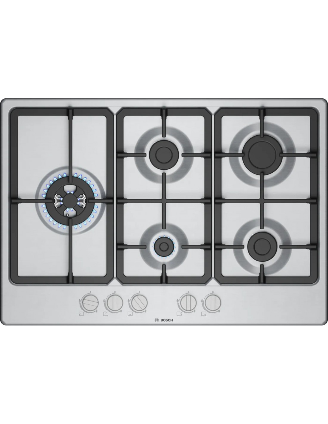 Bosch Serie 4 PGM7B5K90. Colore del prodotto: Acciaio inox, Posizionamento dell'apparecchio: Da incasso, Dimensione della larghezza del piano cottura: 75 cm. Tipo di controllo: Manopola, Posizione di controllo: Front / Top front. Potenza aggregata (gas): 10800 W, Tensione di ingresso AC: 220-240 V, Frequenza di ingresso AC: 50/60 Hz. Larghezza: 750 mm, Profondità: 520 mm, Altezza: 45 mm. Larghezza imballo: 793 mm, Profondità imballo: 597 mm, Altezza imballo: 145 mm