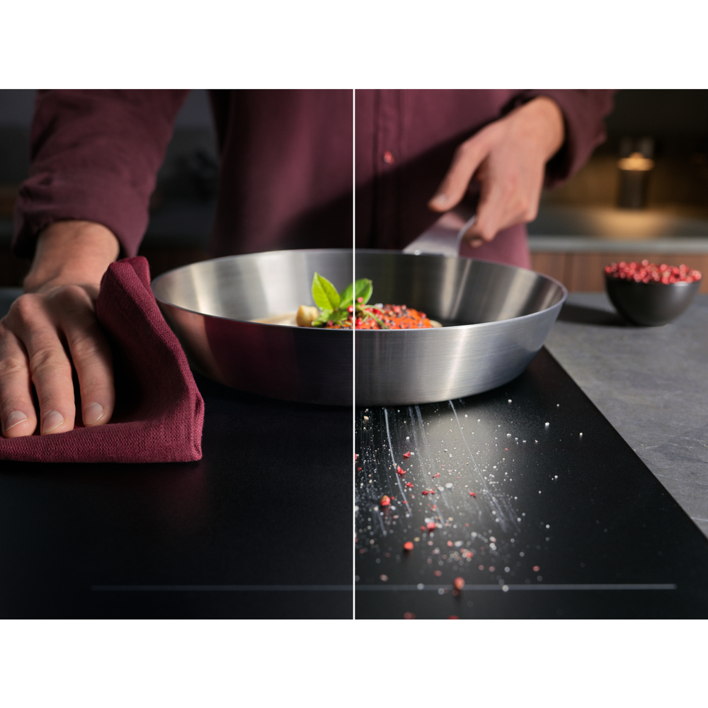 Un tocco moderno per la tua cucina. Il piano cottura SaphirMatt® è realizzato con una finitura nera opaca che ne accentua l'estetica minimal. La superficie è fino a 10 volte più resistente a graffi e impronte rispetto ai piani tradizionali, per una bellezza che dura nel tempo, con meno manutenzione.