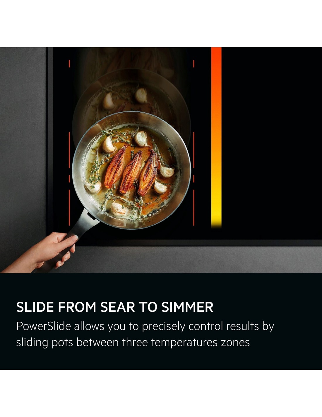 Dall’ebollizione al sobbollimento per mantenere calde le pietanze: se per creare un piatto hai bisogno di cambiare temperatura velocemente più volte, usa PowerSlide. Ti basta spostare la padella da un temperatura all’altra senza dover cambiare le impostazioni mentre cucini.