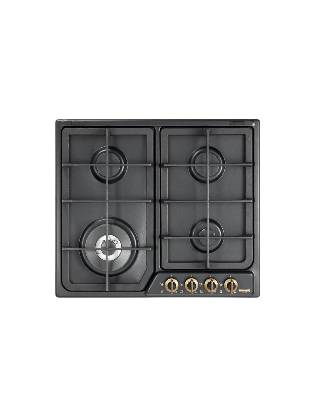 Piano in acciaio inox smaltato antracite con 4 bruciatori, griglie in ghisa ed estetica con finiture in ottone anticato, offrono stile e design a questo piano dal tocco country.