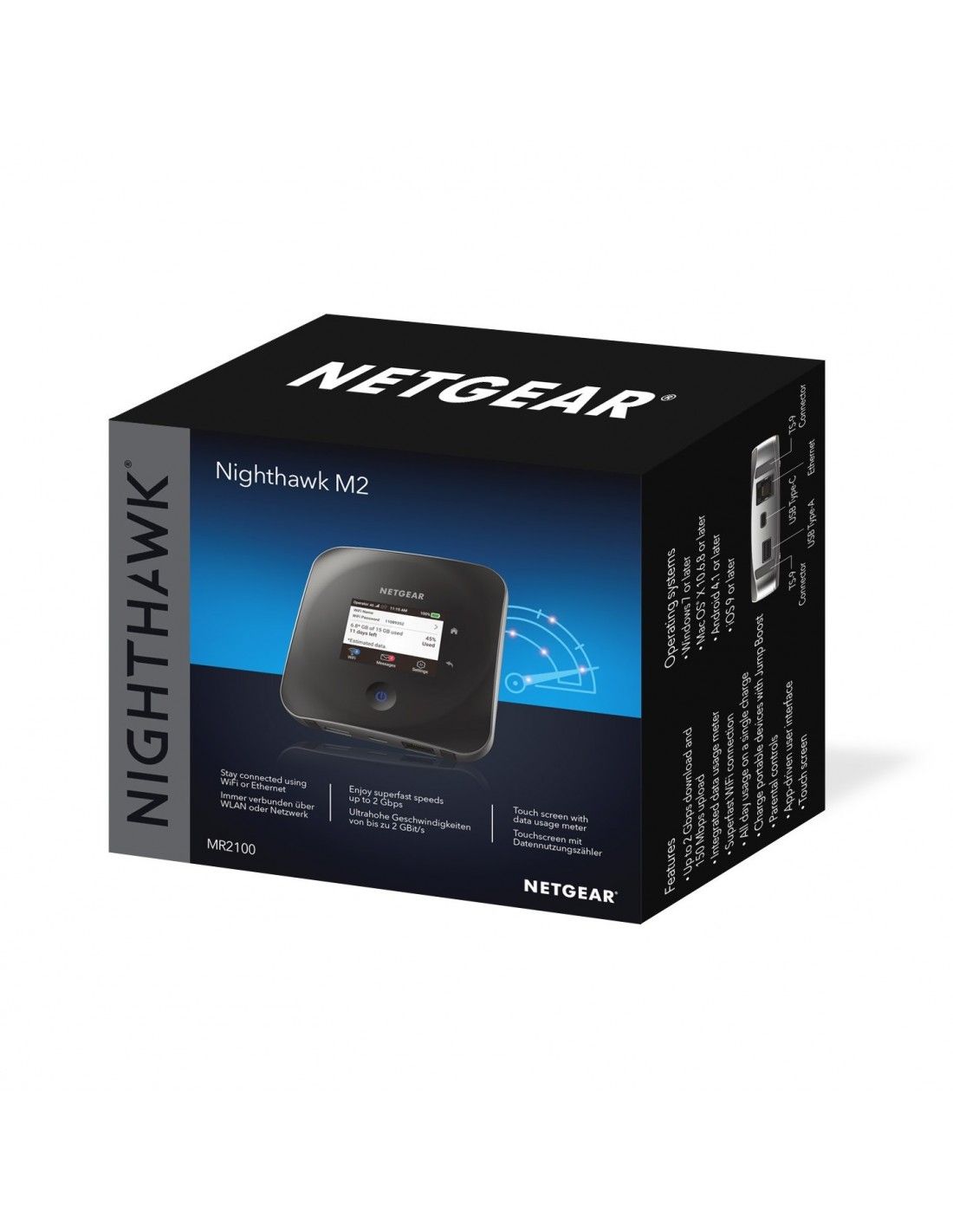 Netgear MR2100. Banda Wi-Fi: Dual-band (2.4 GHz/5 GHz), Wi-Fi standard: Wi-Fi 5 (802.11ac), Intervallo di trasferimento dei dati WLAN (max): 2000 Mbit/s. Standard 4G: LTE, Bande 4G supportate: 700,800,850,900,1800,1900,2100,2300,2500,2600 MHz. Tipo di prodotto: Router portatile, Colore del prodotto: Nero. Tipo di antenna: Interno. Tipologia alimentazione: Batteria, USB, Capacità della batteria: 5040 mAh, Tipo di presa: Tipo C