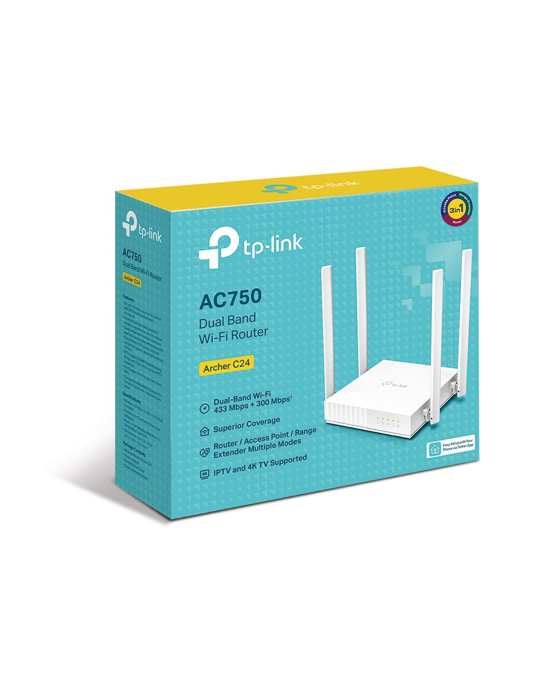 TP-Link ARCHER C24. Banda Wi-Fi: Dual-band (2.4 GHz/5 GHz), Wi-Fi standard: Wi-Fi 5 (802.11ac), Intervallo di trasferimento dei dati WLAN (max): 433 Mbit/s. Tipo di interfaccia LAN Ethernet: Fast Ethernet, Velocità trasferimento Ethernet LAN: 10,100 Mbit/s, Standard di rete: IEEE 802.11a, IEEE 802.11ac, IEEE 802.11b, IEEE 802.11g, IEEE 802.11n. Algoritmi di sicurezza supportati: WEP, WPA, WPA2. Tipo di prodotto: Router da tavolo, Colore del prodotto: Bianco. Cavi inclusi: LAN (RJ-45)