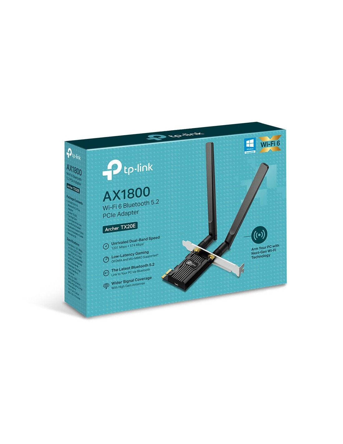 TP-Link Archer TX20E. Interno. Tecnologia di connessione: Wireless, Interfaccia host: PCI Express, Interfaccia: WLAN / Bluetooth. Velocità massima di trasferimento dati: 1800 Mbit/s, Wi-Fi standard: Wi-Fi 6 (802.11ax), Banda Wi-Fi: Dual-band (2.4 GHz/5 GHz). Colore del prodotto: Nero