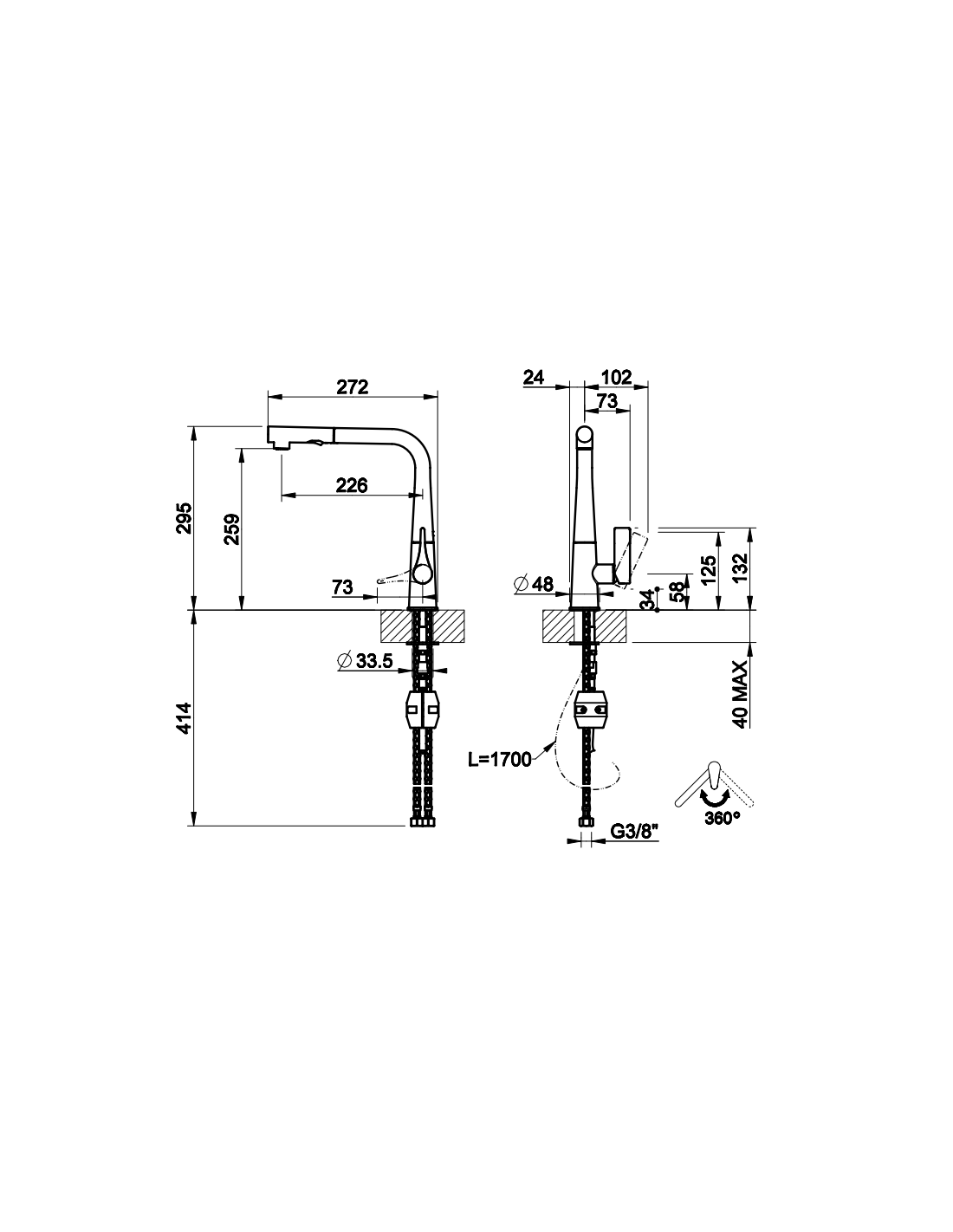 Gessi 17177. Tipo di beccuccio: Estraibile, Colore del prodotto: Acciaio inossidabile, Controllo del flusso d'acqua: Valvole rotanti. Altezza sopra la superficie di fissaggio (max): 29,5 cm, Distanza tra foro di fissaggio e diffusore acqua: 22,6 cm, Distanza diffusore dell'acqua e superficie di fissaggio: 25,9 cm