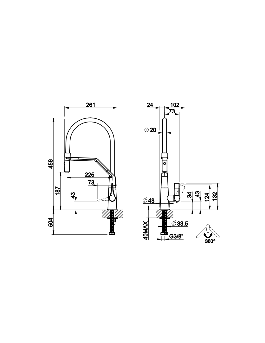 Gessi 17191. Tipo di beccuccio: Tirare verso il basso, Colore del prodotto: Cromo, Controllo del flusso d'acqua: Leva sanitaria. Altezza sopra la superficie di fissaggio (max): 45,6 cm, Distanza tra foro di fissaggio e diffusore acqua: 26,1 cm, Distanza diffusore dell'acqua e superficie di fissaggio: 18,7 cm