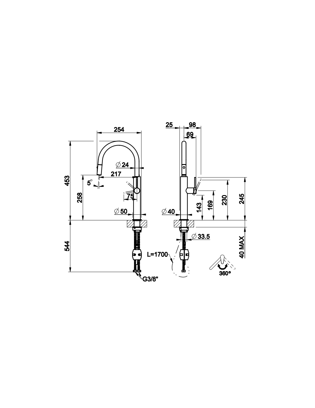 Gessi 60024. Tipo di beccuccio: Estraibile, Colore del prodotto: Acciaio spazzolato, Controllo del flusso d'acqua: Leva sanitaria. Altezza sopra la superficie di fissaggio (max): 45,3 cm, Distanza tra foro di fissaggio e diffusore acqua: 21,7 cm, Distanza diffusore dell'acqua e superficie di fissaggio: 25,8 cm