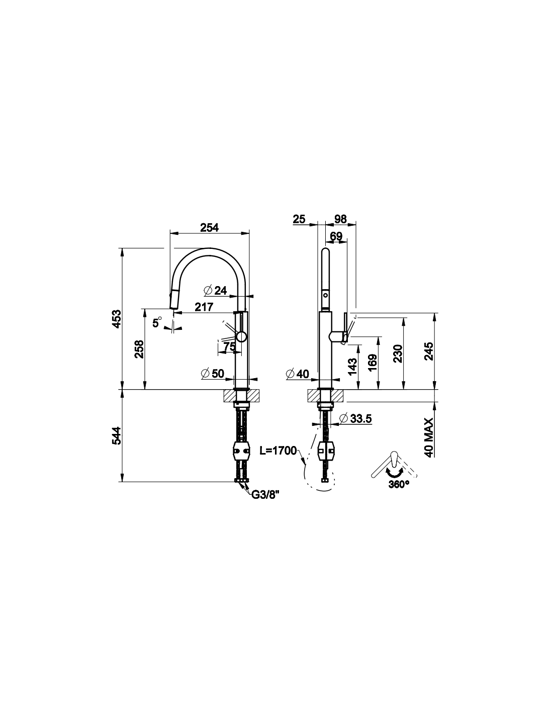 Gessi 60022. Tipo di beccuccio: Estraibile, Colore del prodotto: Nero, Controllo del flusso d'acqua: Leva sanitaria. Altezza sopra la superficie di fissaggio (max): 45,3 cm, Distanza tra foro di fissaggio e diffusore acqua: 21,7 cm, Distanza diffusore dell'acqua e superficie di fissaggio: 25,8 cm
