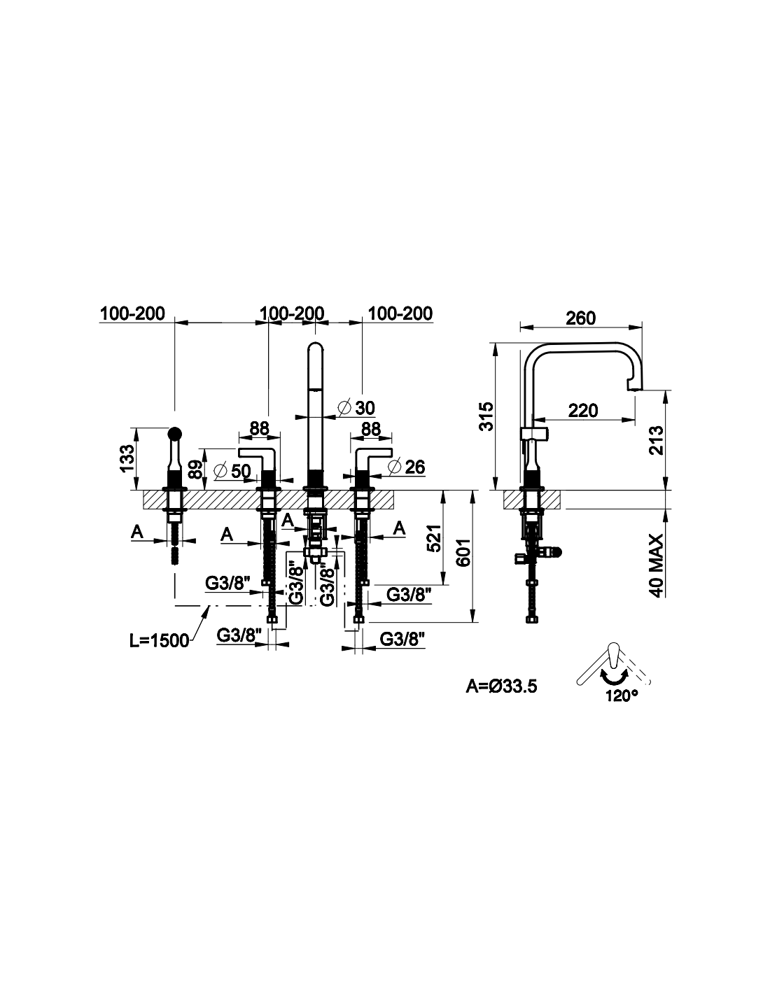 Rubinetto Gessi 58703 713. Girevole con Angolo di rotazione 120°. Altezza sopra la superficie di fissaggio (max) 31,5 cm. Controllo del flusso d'acqua Valvole rotanti.