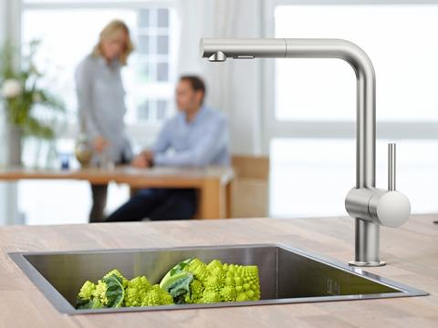 Passare dal robusto getto a doccia al mousseur delicato con la semplice pressione di un pulsante ti consente di gestire la cucina come un vero professionista. Il rubinetto è dotato di bocca alta per una maggior praticità e la doccetta ruota con un raggio di 360° per consentire una pulizia agevole dell’intera superficie di lavoro.