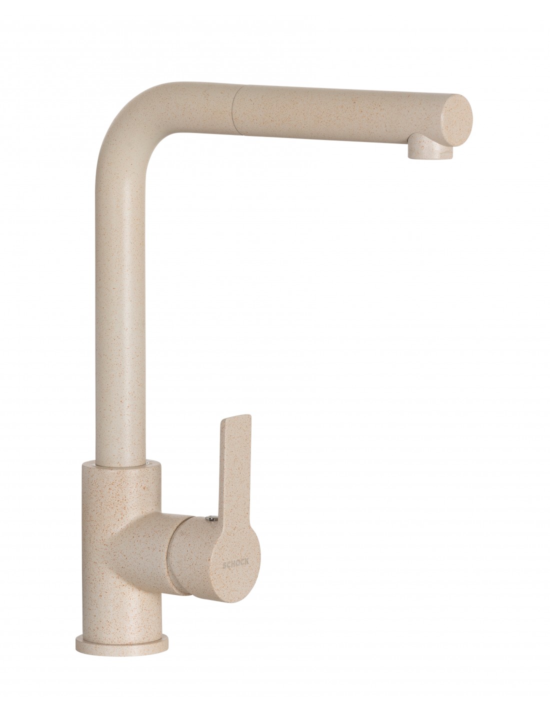 Miscelatore monocomando con canna alta a ponte con doccetta estraibile.