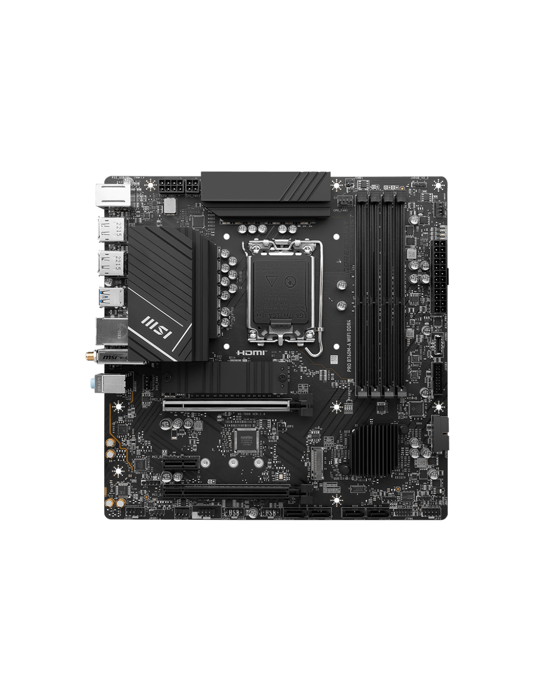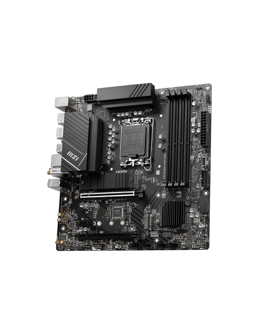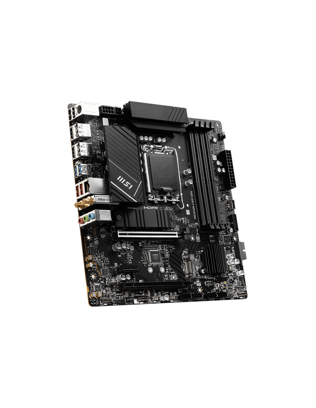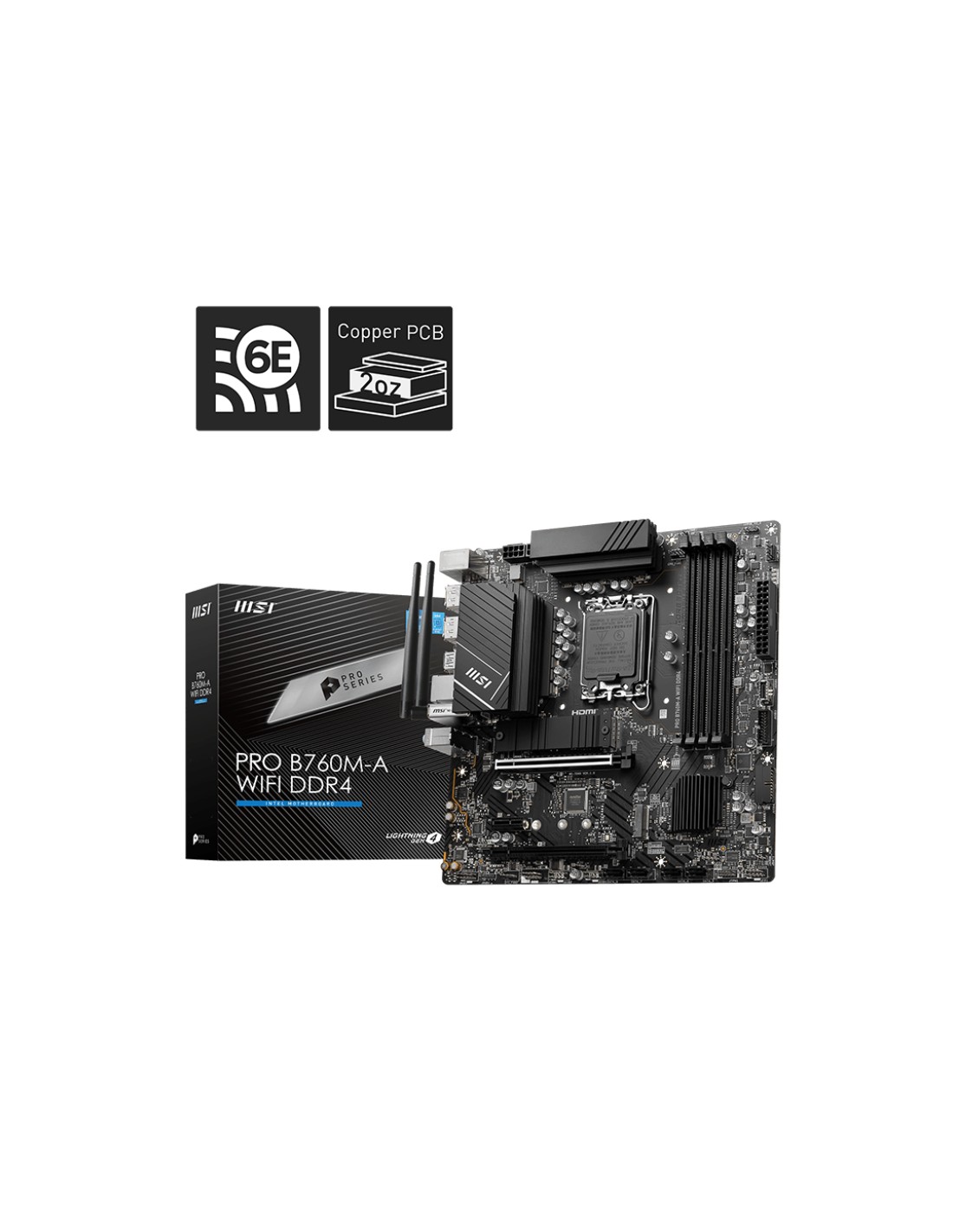 MSI PRO B760M-A WIFI DDR4. Produttore processore: Intel, Presa per processore: LGA 1700, Processori compatibili: Intel® Celeron®, Intel® Pentium® Gold. Tipi di memoria supportati: DDR4-SDRAM, RAM massima supportata: 128 GB, tipo di slot di memoria: DIMM. Interfacce dell'unità di archiviazione supportate: M.2, SATA III, Livelli RAID: 0, 1, 5, 10. Tipo di interfaccia Ethernet: 2.5 Gigabit Ethernet. Componente per: PC, Fattore di forma scheda madre: micro ATX, Famiglia di chipset per scheda madre: Intel