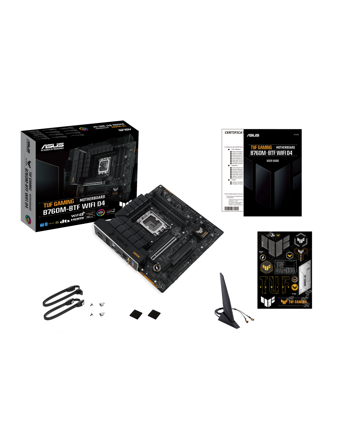ASUS TUF GAMING B760M-BTF WIFI D4. Produttore processore: Intel, Presa per processore: LGA 1700, Processori compatibili: Intel® Celeron®, Intel® Core™ i3, Intel® Core™ i5, Intel® Core™ i7, Intel® Core™ i9,.... Tipi di memoria supportati: DDR4-SDRAM, RAM massima supportata: 128 GB, tipo di slot di memoria: DIMM. Interfacce dell'unità di archiviazione supportate: M.2, SATA III, Tipi di unità di archiviazione supportate: HDD & SSD, Livelli RAID: 0, 1, 5, 10. Tipo di interfaccia Ethernet: 2.5 Gigabit Ethernet, Wi-Fi standard: Wi-Fi 6 (802.11ax), Standard Wi-Fi: 802.11a, 802.11b, 802.11g, Wi-Fi 4 (802.11n), Wi-Fi 5 (802.11ac), Wi-Fi 6 (802.11ax). Componente per: PC, Fattore di forma scheda madre: micro ATX, Famiglia di chipset per scheda madre: Intel