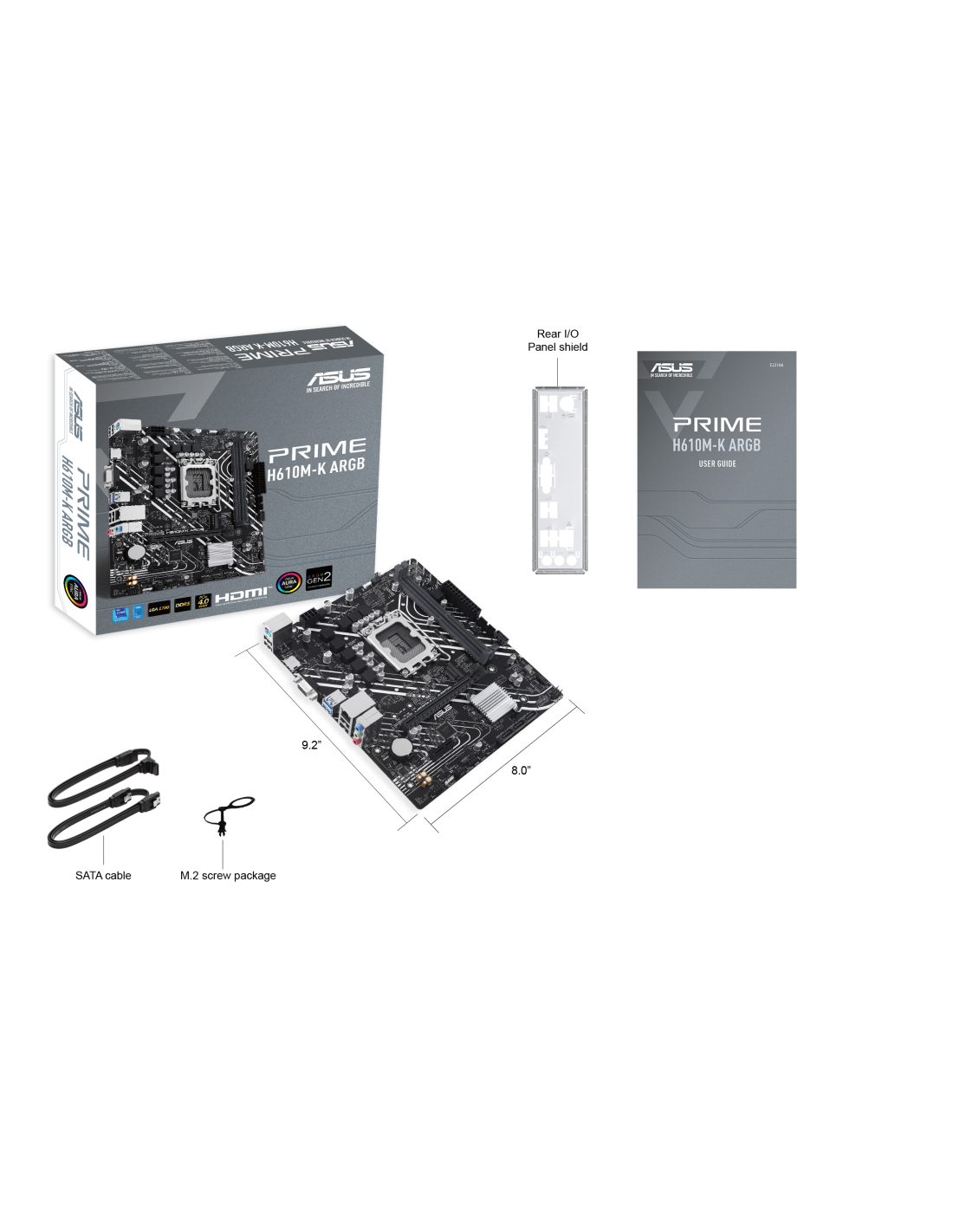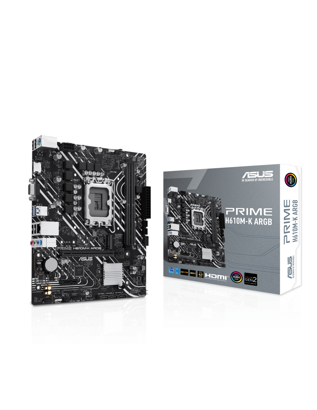 ASUS PRIME H610M-K ARGB. Produttore processore: Intel, Presa per processore: LGA 1700, Processori compatibili: Intel® Celeron®, Intel® Core™ i3, Intel® Core™ i5, Intel® Core™ i7, Intel® Core™ i9,.... Tipi di memoria supportati: DDR5-SDRAM, RAM massima supportata: 96 GB, tipo di slot di memoria: DIMM. Interfacce dell'unità di archiviazione supportate: M.2, SATA, Tipi di unità di archiviazione supportate: HDD & SSD. Tipo di interfaccia Ethernet: Gigabit Ethernet. Componente per: PC, Fattore di forma scheda madre: micro ATX, Famiglia di chipset per scheda madre: Intel