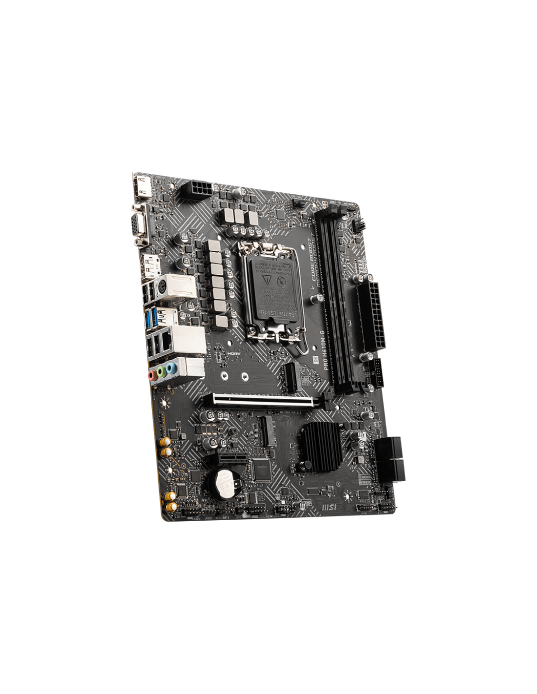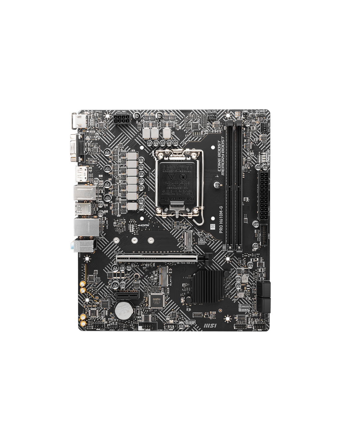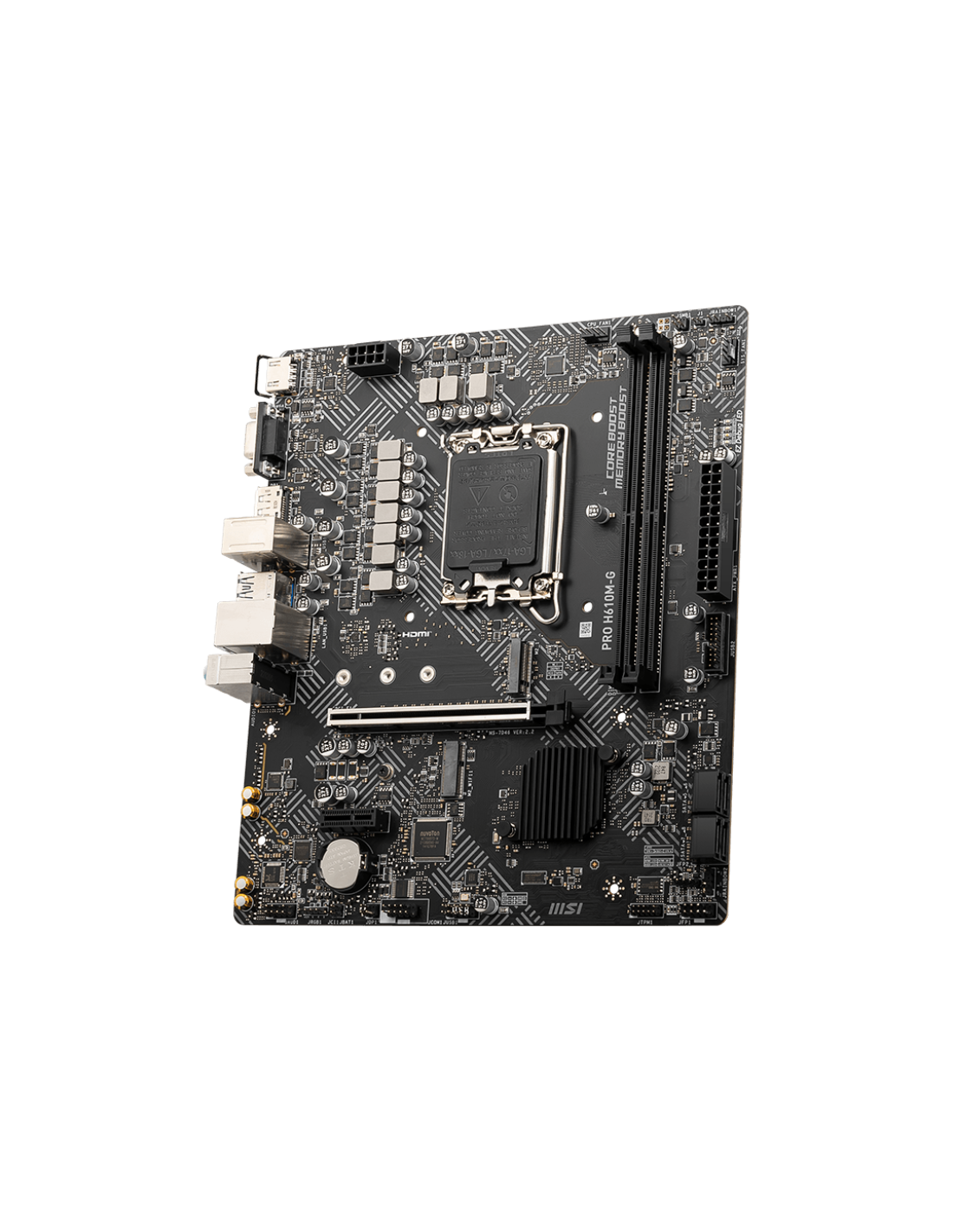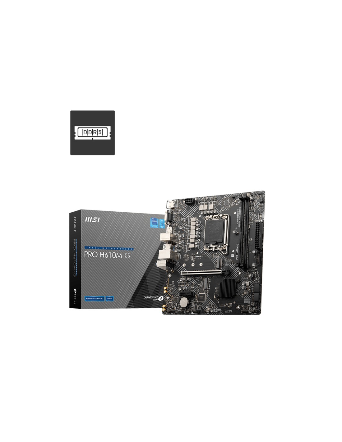 MSI PRO H610M-G. Produttore processore: Intel, Presa per processore: LGA 1700, Processori compatibili: Intel® Core™ i9. Tipi di memoria supportati: DDR5-SDRAM, RAM massima supportata: 96 GB, tipo di slot di memoria: DIMM. Interfacce dell'unità di archiviazione supportate: M.2, SATA III, Tipi di unità di archiviazione supportate: SSD. Tipo di interfaccia Ethernet: Gigabit Ethernet. Componente per: PC, Fattore di forma scheda madre: micro ATX, Famiglia di chipset per scheda madre: Intel