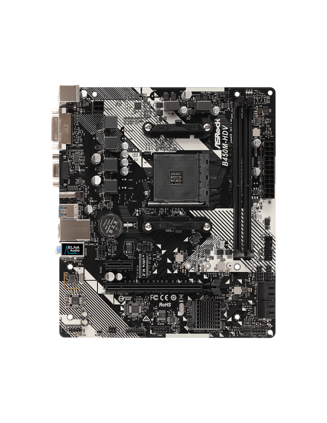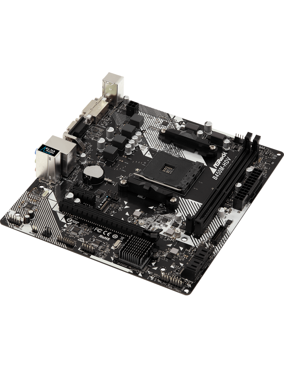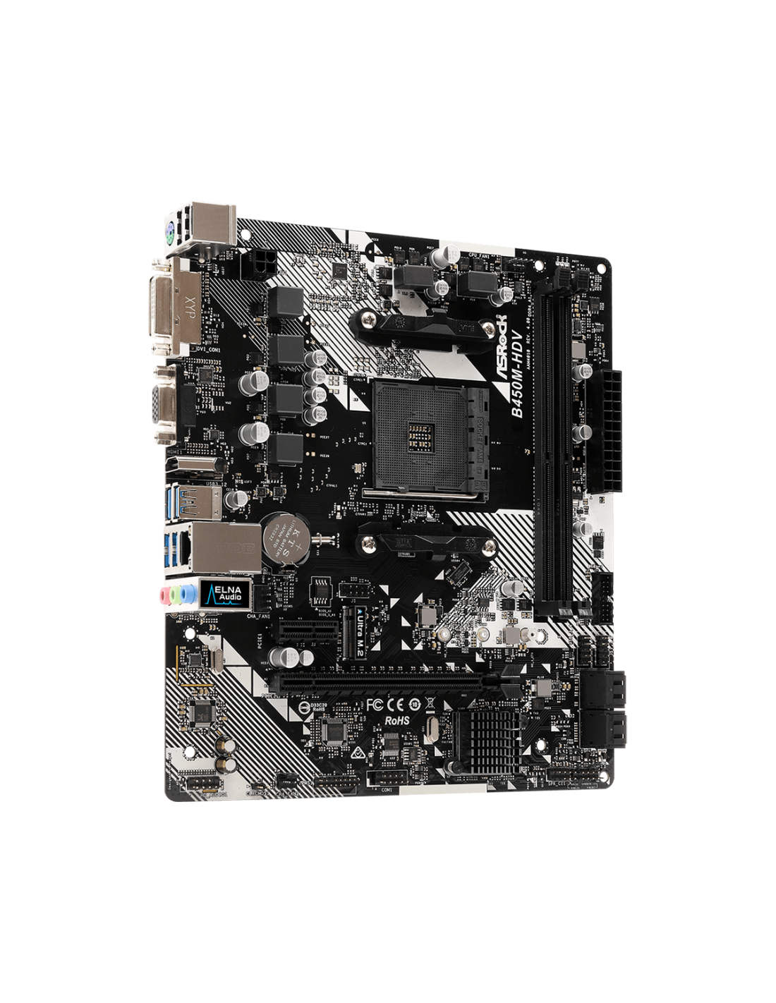 Asrock B450M-HDV R4.0. Produttore processore: AMD, Presa per processore: Presa AM4, Processori compatibili: AMD Ryzen. Tipi di memoria supportati: DDR4-SDRAM, tipo di slot di memoria: DIMM, Velocità di memoria supportate: 2133,2400,2667,2933,3200 MHz. Interfacce dell'unità di archiviazione supportate: M.2,PCI Express 3.0,Serial ATA III, Tipi di unità di archiviazione supportate: HDD,SSD. Famiglia della scheda grafica: AMD, Risoluzione massima: 4096 x 2160 Pixel. Tipo di interfaccia Ethernet: Gigabit Ethernet, Controller LAN: Realtek RTL8111H