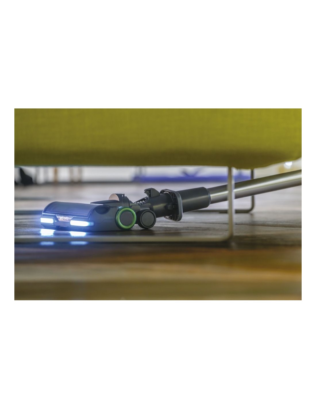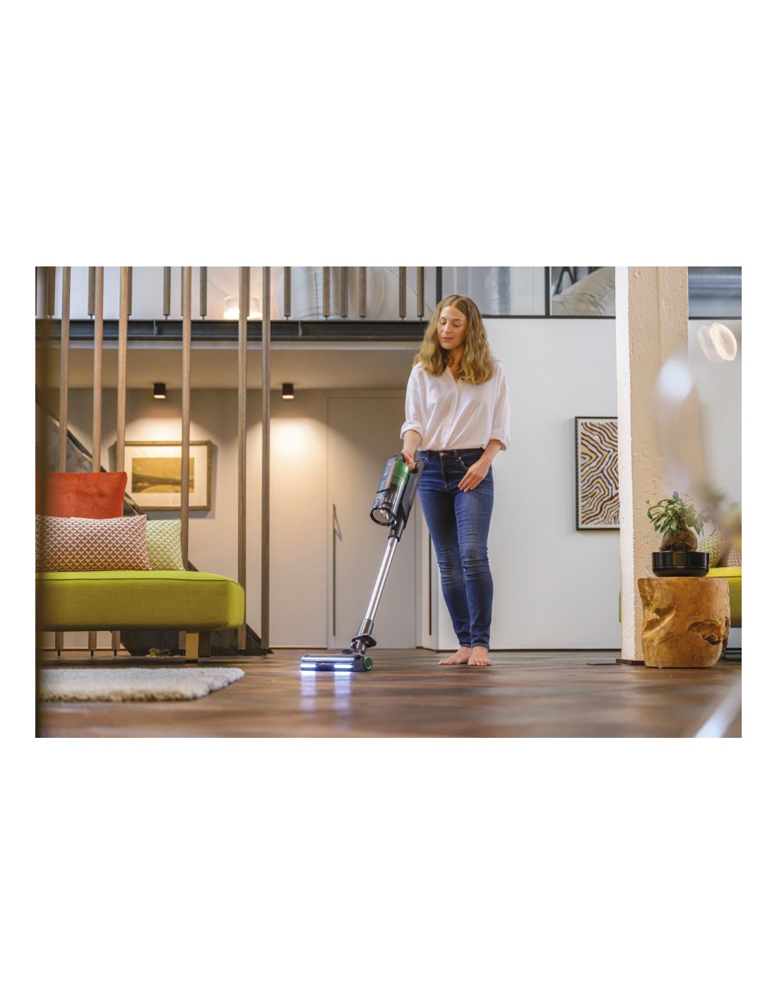 La spazzola di HF9 è dotata di 2 luci LED fredde per individuare meglio la polvere nascosta anche nelle zone buie. Sono integrate all'interno di un paraurti che si prende cura di battiscopa e mobili.
