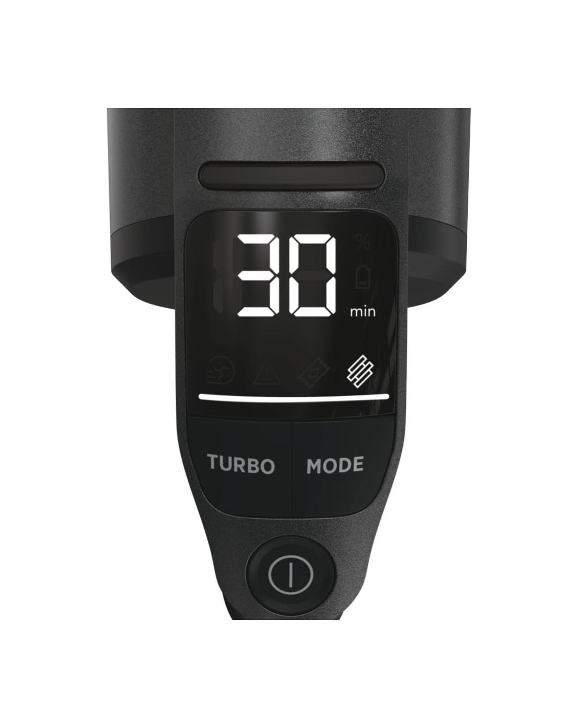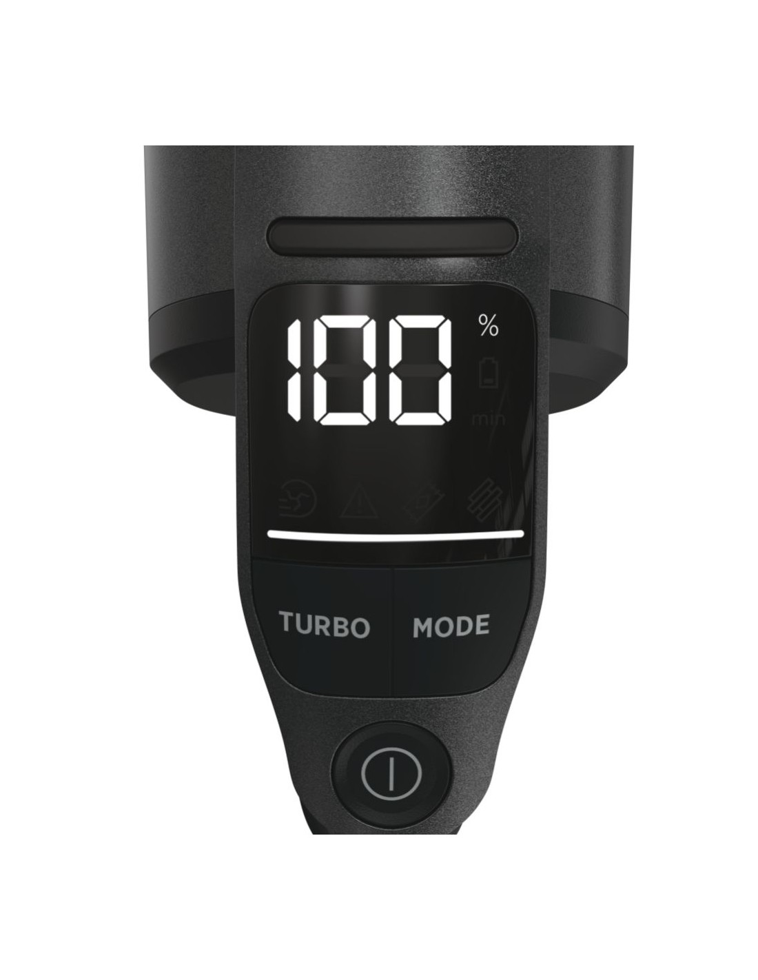 HFX è dotato di una batteria rimovibile agli ioni di litio, che può essere caricata direttamente sull'aspirapolvere o separatamente. La potente batteria da 4000 mAh può raggiungere rapidamente il 100% di carica in 3,5 ore. Controlla la percentuale di carica direttamente sul display LED.