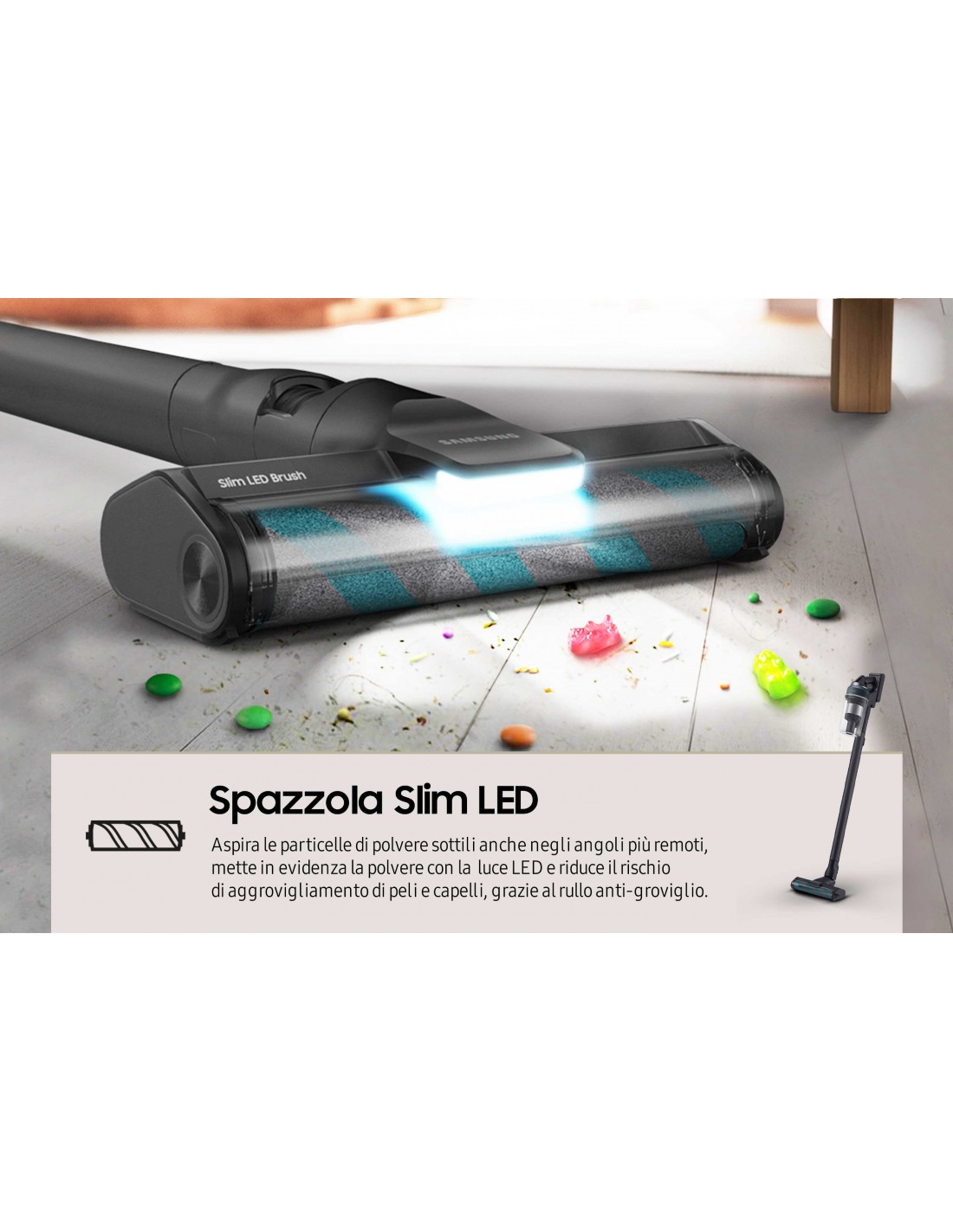Spazzola Slim LED[15] La spazzola Slim LED[15] è provvista di una pratica luce a LED che consente di scovare e raccogliere la polvere anche negli angoli più bui. La struttura incredibilmente sottile e leggera[16] ruota di 180° per facilitare i movimenti, mentre lo speciale rullo anti-groviglio evita che peli e capelli restino impigliati tra le spazzole[17]. Il rullo, inoltre, è facilissimo da staccare per procedere alla manutenzione.