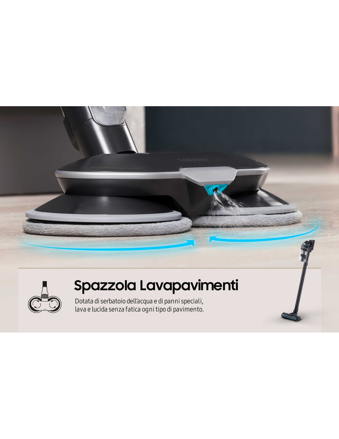 Spazzola lavapavimentiPulisci facilmente le superfici dure con la spazzola lavapavimenti, che con i dischi in microfibra ruota a 260 giri/min fino a 10min. Puoi anche spruzzare manualmente più acqua grazie al serbatoio di 150ml.