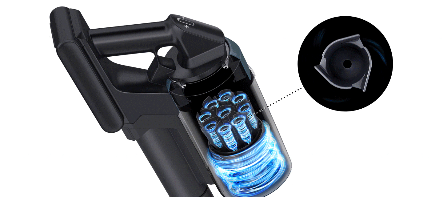 Jet CycloneLelevata efficienza e la struttura multiciclonica del sistema Jet Cyclone sono sinonimo di aria più pulita e potenza daspirazione estrema. Grazie ai 9 vortici dotati di 27 ingressi, laria segue un percorso ottimale che riduce la perdita di forza aspirante. Inoltre, il sistema trattiene le particelle di polvere allinterno del dispositivo, nel segno della massima igiene.