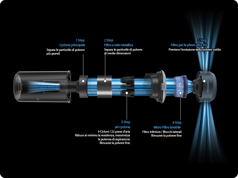 Sistema di filtraggio multistrato efficace al 99,999%Lo speciale sistema di filtraggio multistrato trattiene fino al 99,999%[7] della polvere[8] e riduce lesposizione agli allergeni di origine animale[9] , per emettere solo aria pulita. Mentre il filtro ciclonico e la griglia in maglia metallica trattengono le particelle più grossolane, il sistema Jet Cyclone e il micro-filtro pensano alle particelle più piccole. Il filtro per le polveri ultra-sottili completa lopera[8].