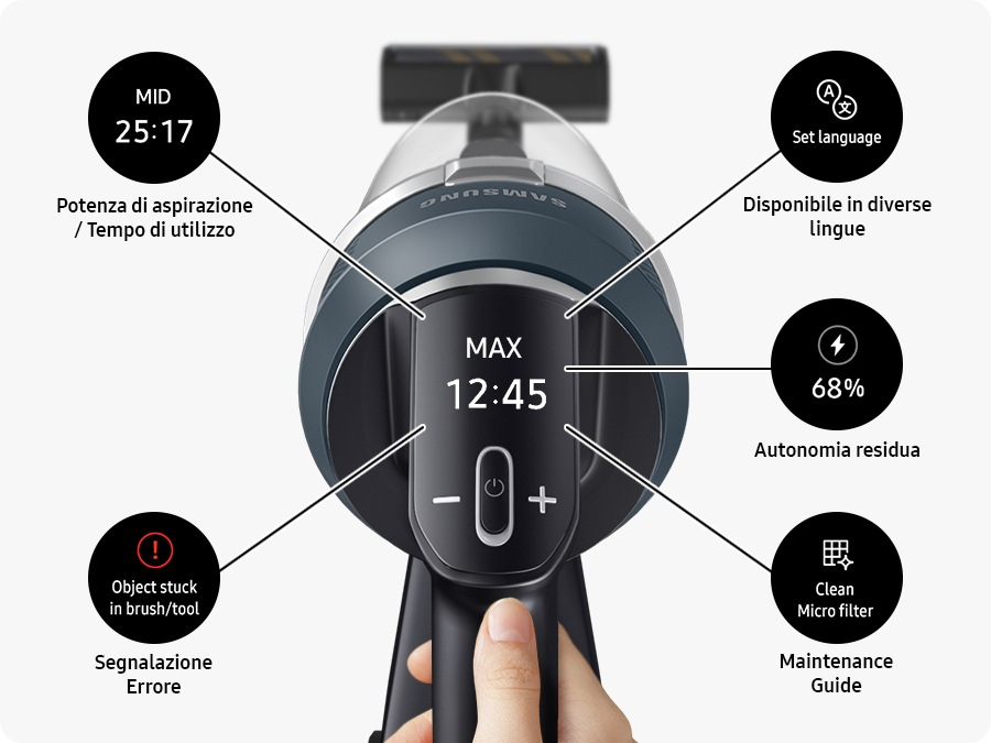 Display digitale LCDControlla e gestisci il tuo aspirapolvere in modo intuitivo con il display digitale LCD, che supporta diverse lingue. Basta unocchiata per conoscere il livello di aspirazione e lautonomia residua della batteria. In più, ti avvisa in caso di problemi proponendoti una soluzione. Durante la ricarica visualizza la percentuale già raggiunta.