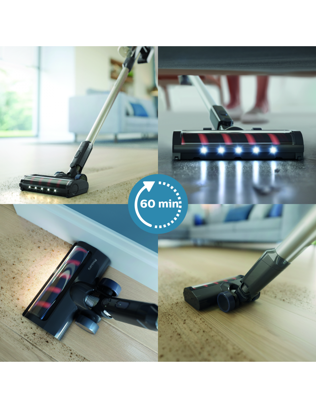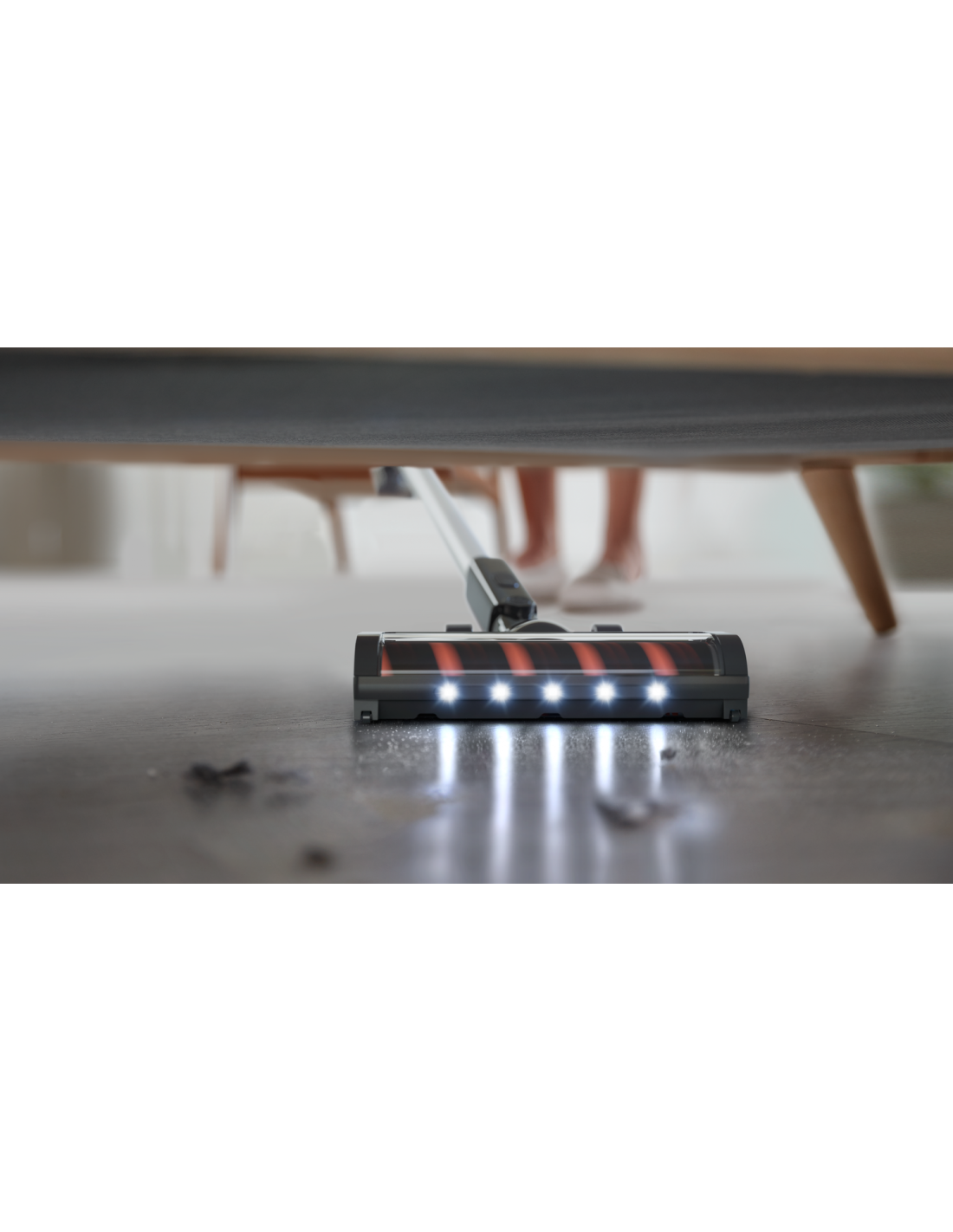 Dai valore a ogni movimento con la spazzola LED, catturando fino al 99% di polvere e sporco nell'impostazione più alta(4). Illumina le minuscole particelle di polvere emettendo luce in modo preciso alla giusta angolazione, per sapere esattamente dove pulire. La spazzola è progettata per scorrere rasente alle pareti e ai bordi, catturando le particelle di sporco più ostinate. Rimuovi fino all'ultimo granello di polvere.