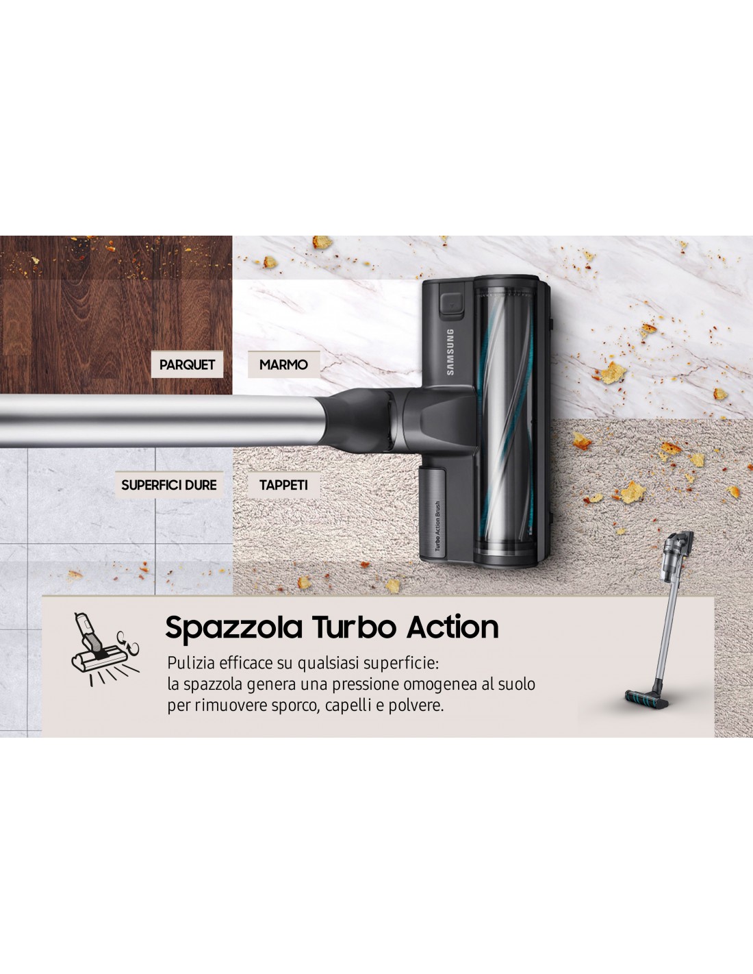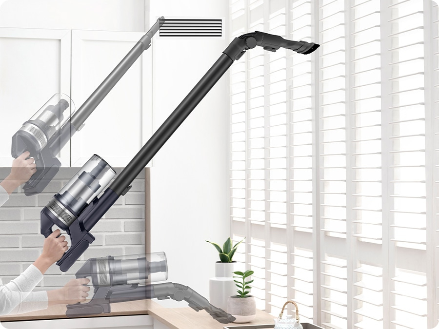 Pulisci la tua casa senza sforzo e con il massimo controllo. Il design ultra leggero assicura la massima praticità e riduce il rischio di traumi al polso. Il corpo della scopa pesa appena 1,66 kg, il 12% in meno[7] rispetto ai tradizionali aspirapolvere Samsung. In questo modo puoi pulire facilmente tutta la casa.