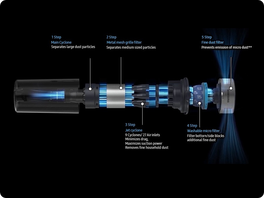 Sistema di filtraggio multistrato efficace al 99,999%Lo speciale sistema di filtraggio multistrato trattiene fino al 99,999%[5] della polvere[6] rilasciando aria pulita. Mentre il filtro ciclonico e la griglia in maglia metallica trattengono le particelle più grossolane, il sistema Jet Cyclone e il micro-filtro bloccano le particelle più piccole. Infine, il filtro per le polveri sottili intrappola le micropolveri[6] , nocive per la salute.