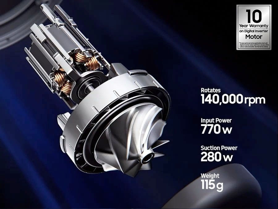 Motore HexaJetPulizia efficace, senza fatica. Leggero[9] e potente, il Motore HexaJet ha un design innovativo e progettato per ottimizzare il flusso d'aria e l'efficienza. Il Motore Digital Inverter, garantito 10 anni[10] , offre una potenza in entrata di 770 W[11] e fino a 280 W di potenza aspirante.