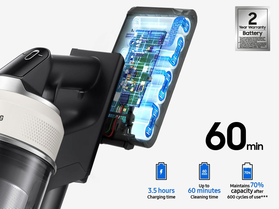 Batteria sostituibile e a più lunga durataGrazie alla batteria ad elevata capacità, che garantisce fino a 60 minuti di autonomia, potrai dedicarti alle pulizie di casa più a lungo senza bisogno di ricaricare l'aspirapolvere. Potrai rimuoverla e sostituirla con una batteria di ricambio per continuare a pulire anche fino a 2 ore. La batteria conserva il 70% delle prestazioni iniziali anche dopo 500 cicli. Inoltre, offre un controllo di sicurezza con il Battery Management System e una garanzia di 2 anni sulle batterie.
