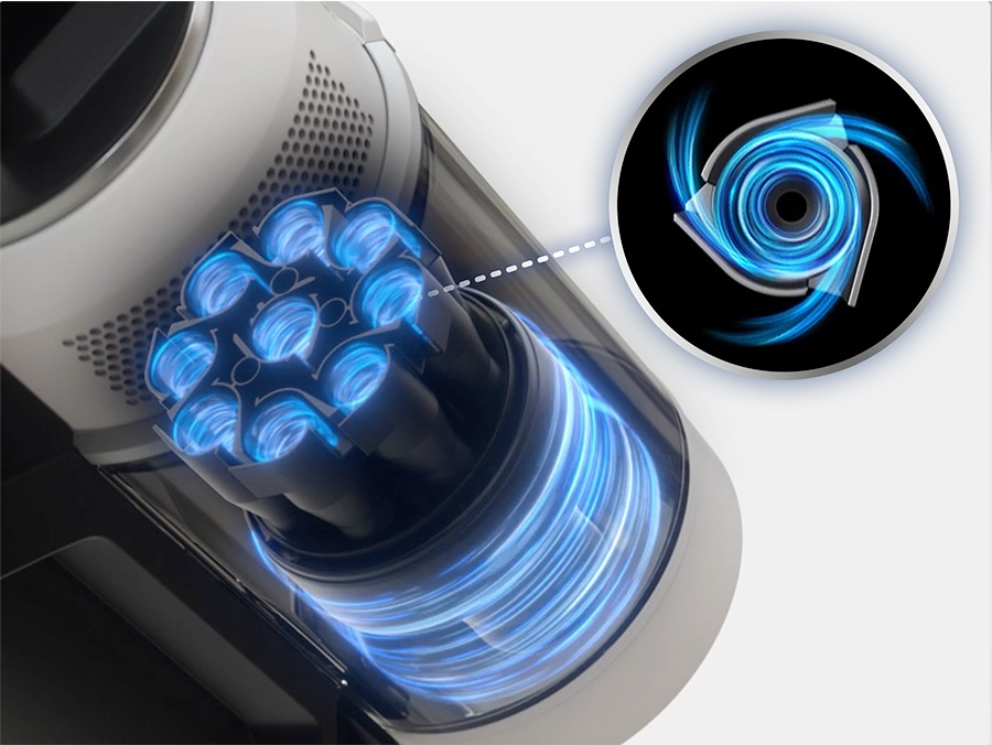 L'elevata efficienza e la struttura multiciclonica del sistema Jet Cyclone sono sinonimo di aria più pulita ed elevata potenza d'aspirazione. Grazie ai 9 vortici dotati di 27 ingressi, l'aria segue un percorso ottimale che riduce al minimo la perdita di forza aspirante. Inoltre, il sistema trattiene le particelle di polvere all'interno del dispositivo, per la massima igiene.