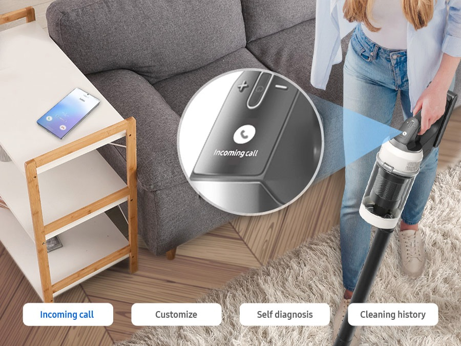 Personalizza l'aspirapolvere per una pulizia pratica ed efficace. La funzionalità Smart Wi-Fi dell'app SmartThings[12] ti consente di gestire le funzioni e le impostazioni dell'aspirapolvere. L'autodiagnosi smart consente di monitorare lo stato dell'aspirapolvere e fornisce una serie di indicazioni per una manutenzione personalizzata. Inoltre, ti avvisa quando ricevi una chiamata o un messaggio sul telefono[13].