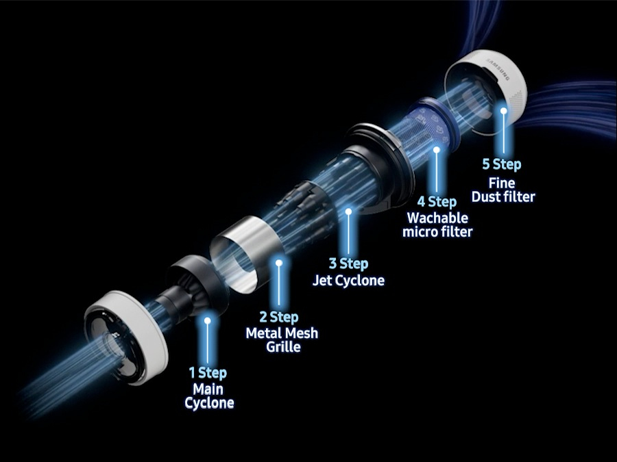 Lo speciale sistema di filtraggio multistrato intrappola fino al 99,999% di polvere[14] emettendo solo aria pulita, mentre il filtro ciclonico e la griglia in maglia metallica trattengono le particelle più grossolane. Il sistema Jet Cyclone e il micro-filtro bloccano quindi le particelle più piccole.