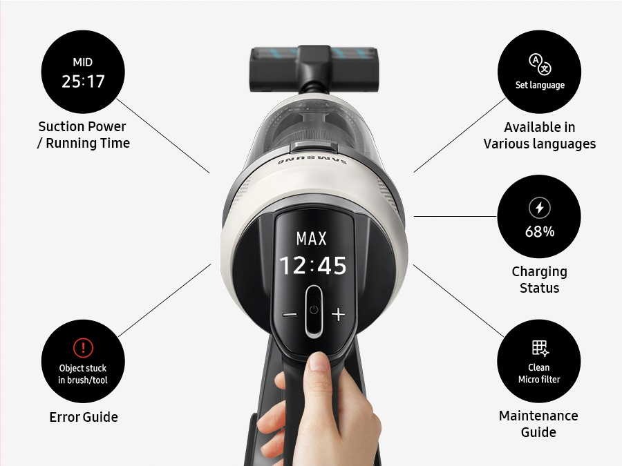 Controlla e gestisci il tuo aspirapolvere in modo più intuitivo con il display digitale LCD, che supporta diverse lingue. Basta un'occhiata per conoscere il livello di aspirazione e l'autonomia residua della batteria[21]. In più, ti avvisa in caso di problemi proponendoti una soluzione, e durante la ricarica visualizza la percentuale già raggiunta.