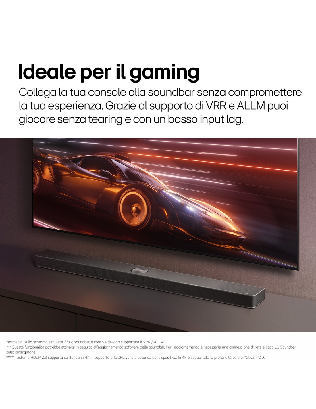 Grazie al 4K pass through, puoi collegare dei lettori Blu-Ray o altri dispositivi via HDMI direttamente alla soundbar e goderti i contenuti in 4K con Dolby Vision, per avere sempre la massima qualità audio e video. Inoltre, se colleghi una console di nuova generazione, potrai sfruttare il VRR fino a 120Hz e la funzione ALLM a garanzia di una migliore reattività dei tuoi videogiochi.