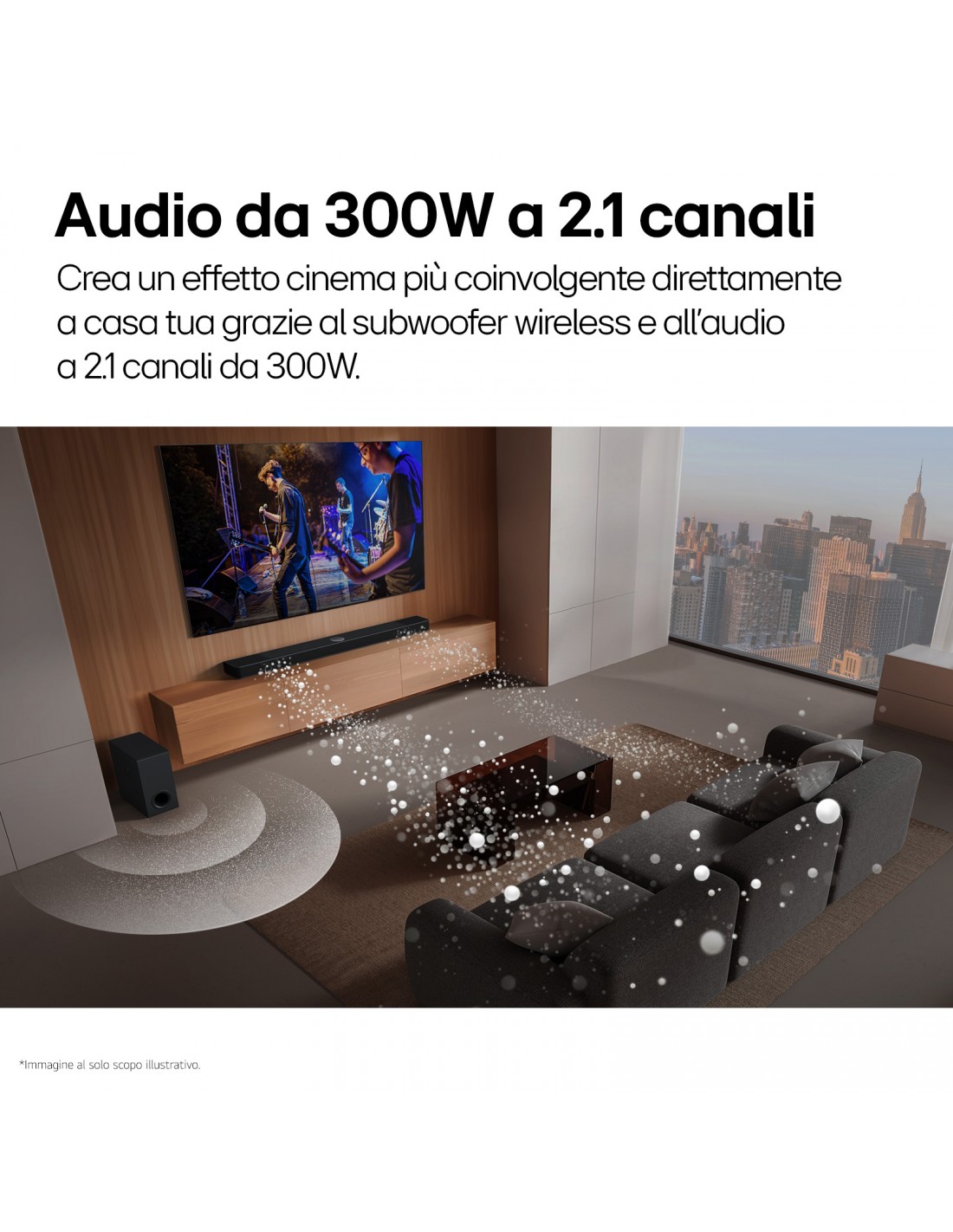 Con 300W distribuiti su 2.1 canali, il suono avrà una maggiore spazialità e profondità, migliorando il livello di immersione nei tuoi contenuti. In questo modo ti sentirai davvero nel mezzo dell'azione o del concerto o del videogioco che stai riproducendo.