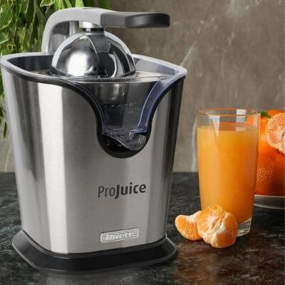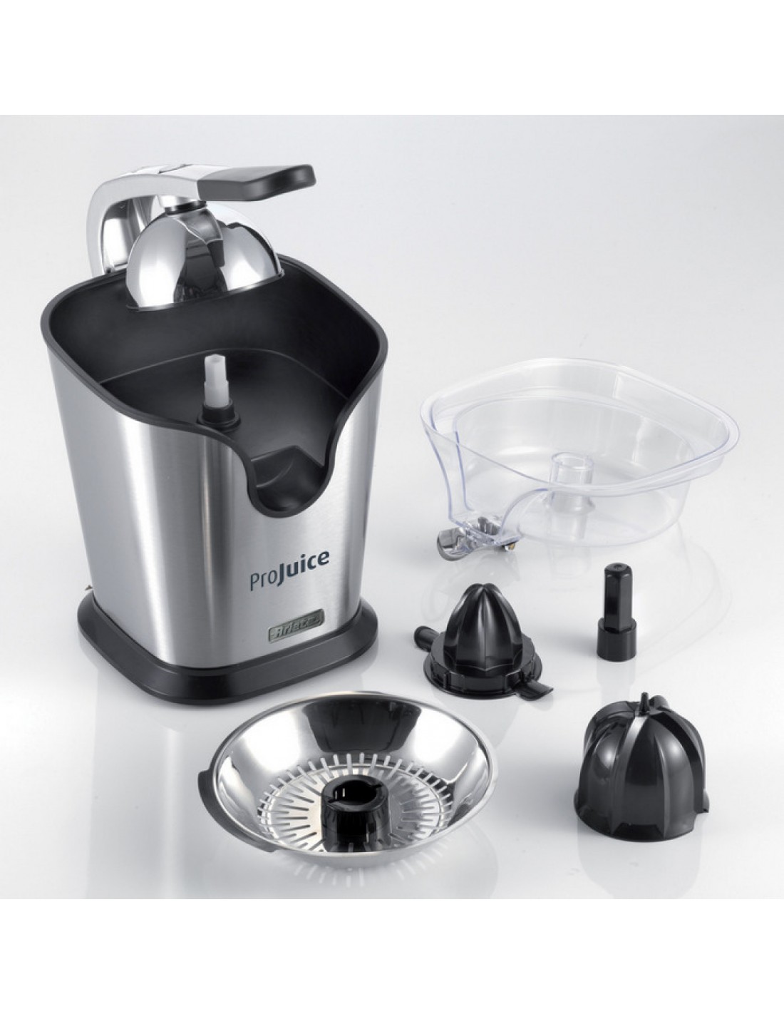 Spremiagrumi elettrico Pro Juice garantisce una spremitura professionale grazie alla leva. Grazie ai 160 watt di potenza, lo spremiagrumi professionale permette di ottenere velocemente ottime spremute direttamente nel bicchiere. Per evitare qualsiasi fuoriuscita, lo spremiagrumi con salvagoccia spreme perfettamente arance e limoni. Una buona spremuta d'arancia a colazione è perfetta per fare il pieno di Vitamica C, sali minerali ed energia!