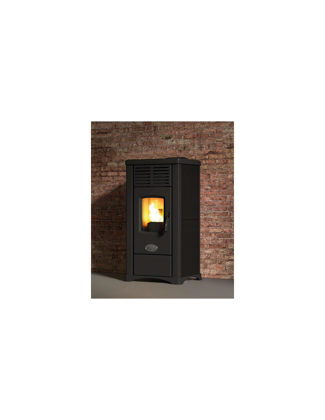 Stufa a pellet con top con profili ghisa, fianchi in ceramica, aria comburente preriscaldata, 3 ventilatori tangenziali, braciere in ghisa con post combustione, cassetto cenere estraibile, porta in ghisa interamente verniciata, telecomando, maniglia estraibile.